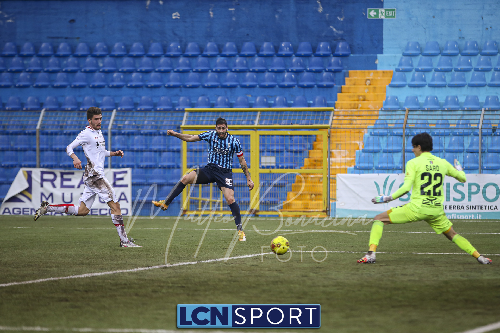 Al 19′ il Lecco concede una brutta palla al limite dell’area, con un po’ di sufficienza, Emmanuello calcia in scivolata, abbondantemente a lato. Al 33′ splendido cross di un convincente Nannini da sinistra, Capogna salta di testa e sfiora la porta, ma il guardalinee segnala fuorigioco. Al 35′ bella azione bluceleste che si sviluppa sulla destra, palla dentro per Capogna che colpisce di testa in torsione e ancora una volta non va lontano dai pali. Al 38′ palla vagante al limite dell’area, potente destro di Lora alto sopra la traversa.