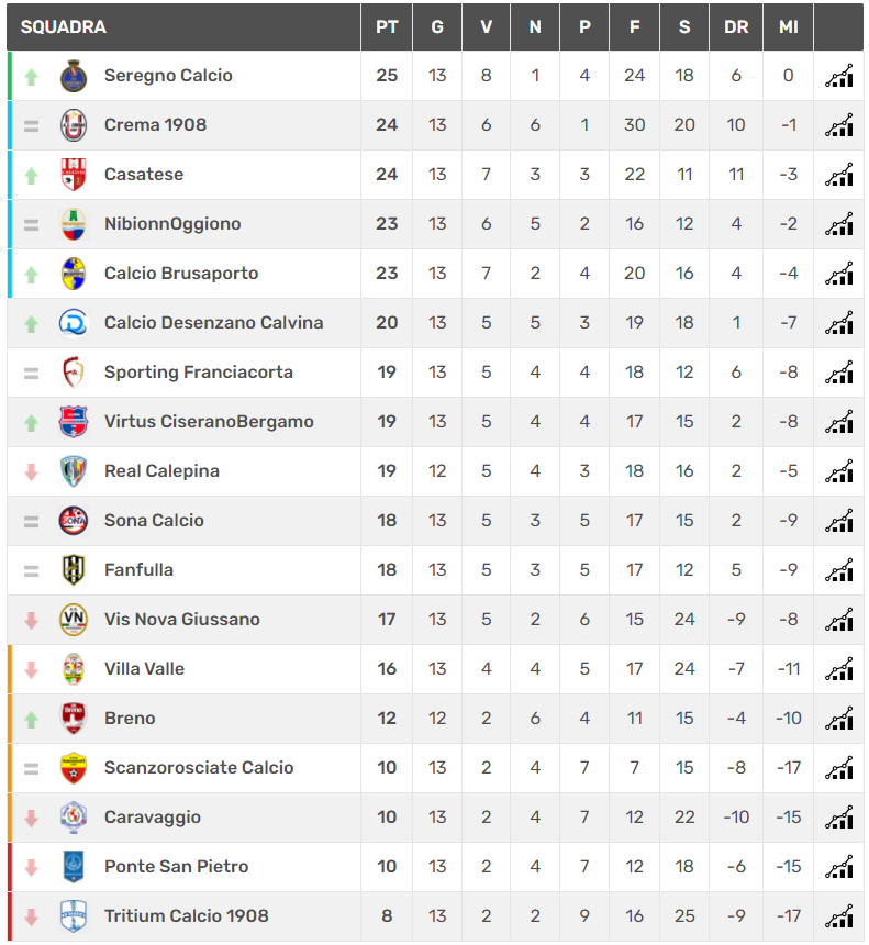 Grazie al successo sui bergamaschi, i biancorossi di mister Danilo Tricarico salgono al secondo posto in classifica, in un girone B che preannuncia bagarre per questa seconda parte di stagione: comanda il Seregno con 25 punti, davanti a Crema e Casatese con 24, quindi Nibionnoggiono e Brusaporto a 23.