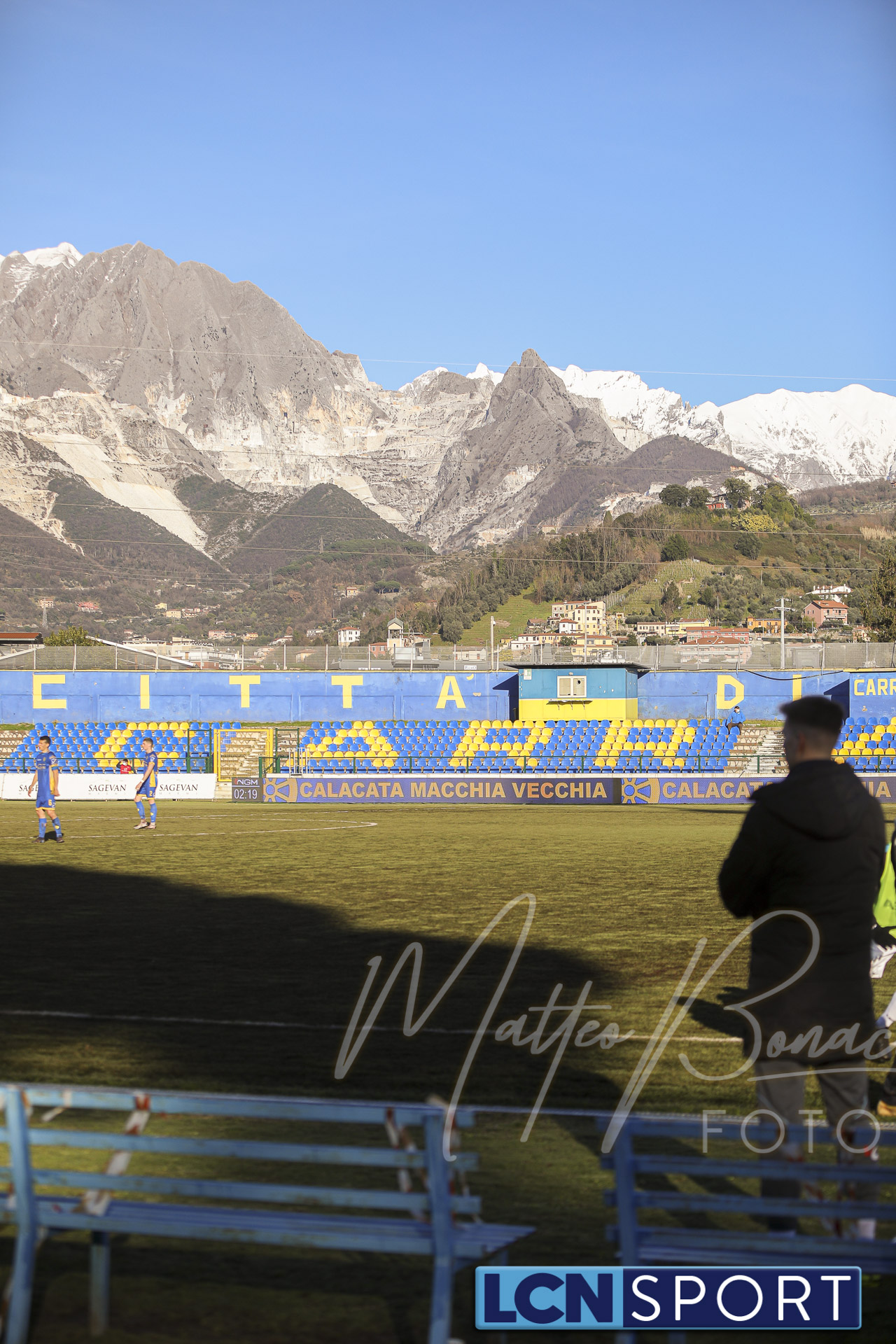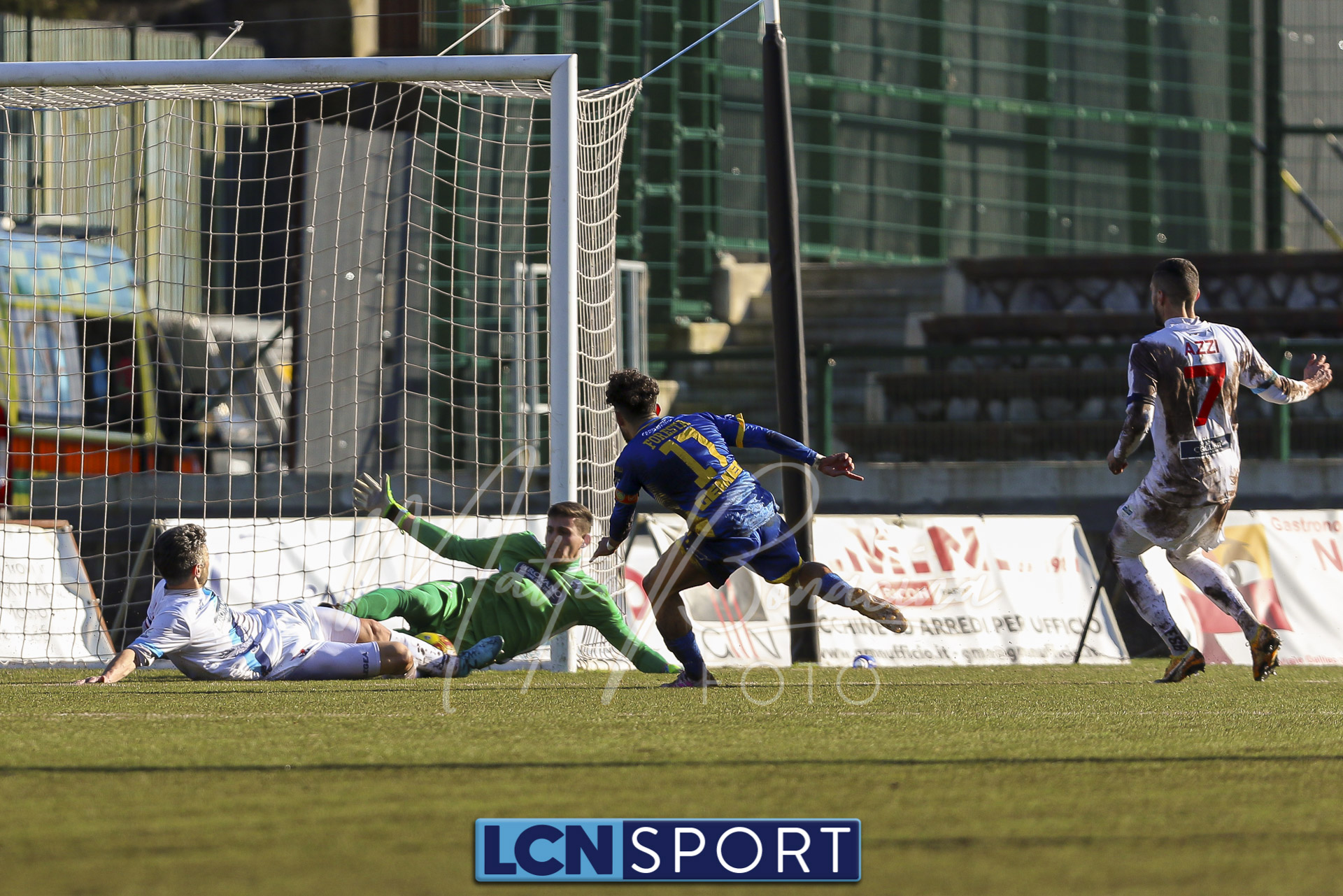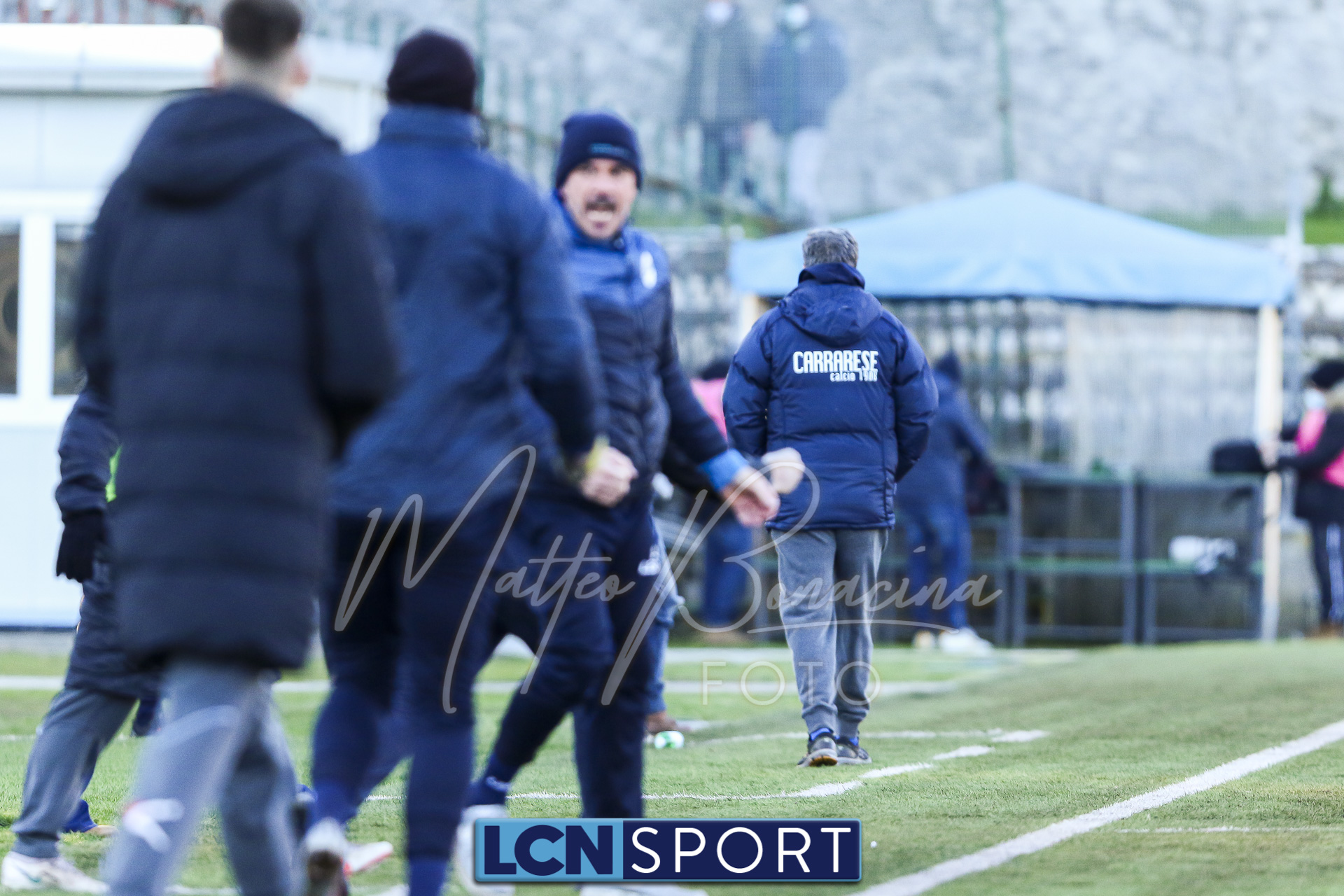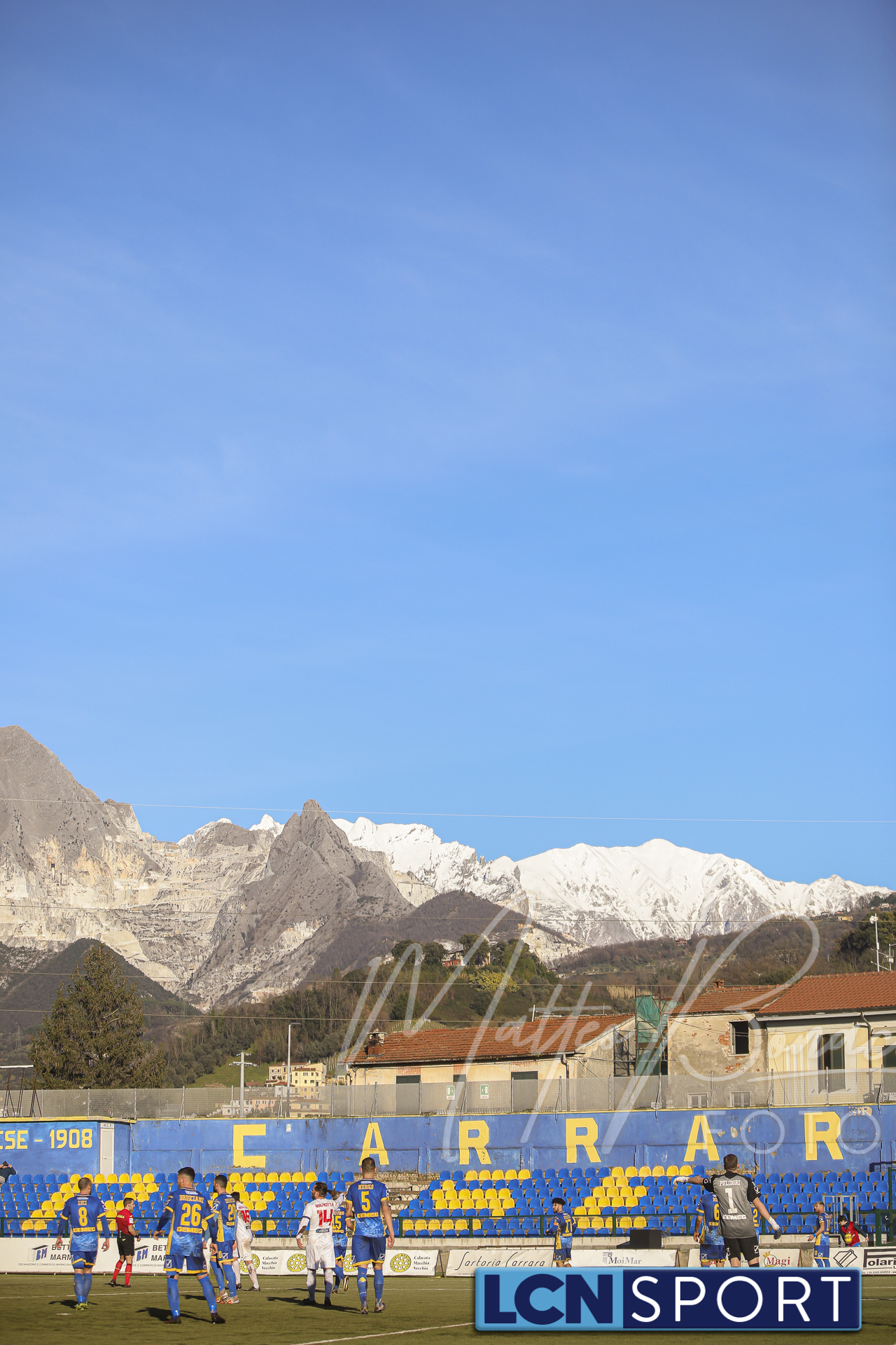 La Carrarese ci prova con la botta di Murolo, centrale, facile per Pissardo. Succede poco fino al 37′: conclusione rasoterra di Foresta e miracolo in coabitazione tra Marzorati e il portiere bluceleste per salvare il risultato. Al 42′ Marotta (entrato per Bolzoni) recupera palla e apre sulla destra per Iocolano che non ci pensa su e trafigge Pulidori con un preciso diagonale sul palo lontano. Si va al riposo sul 2-0.