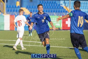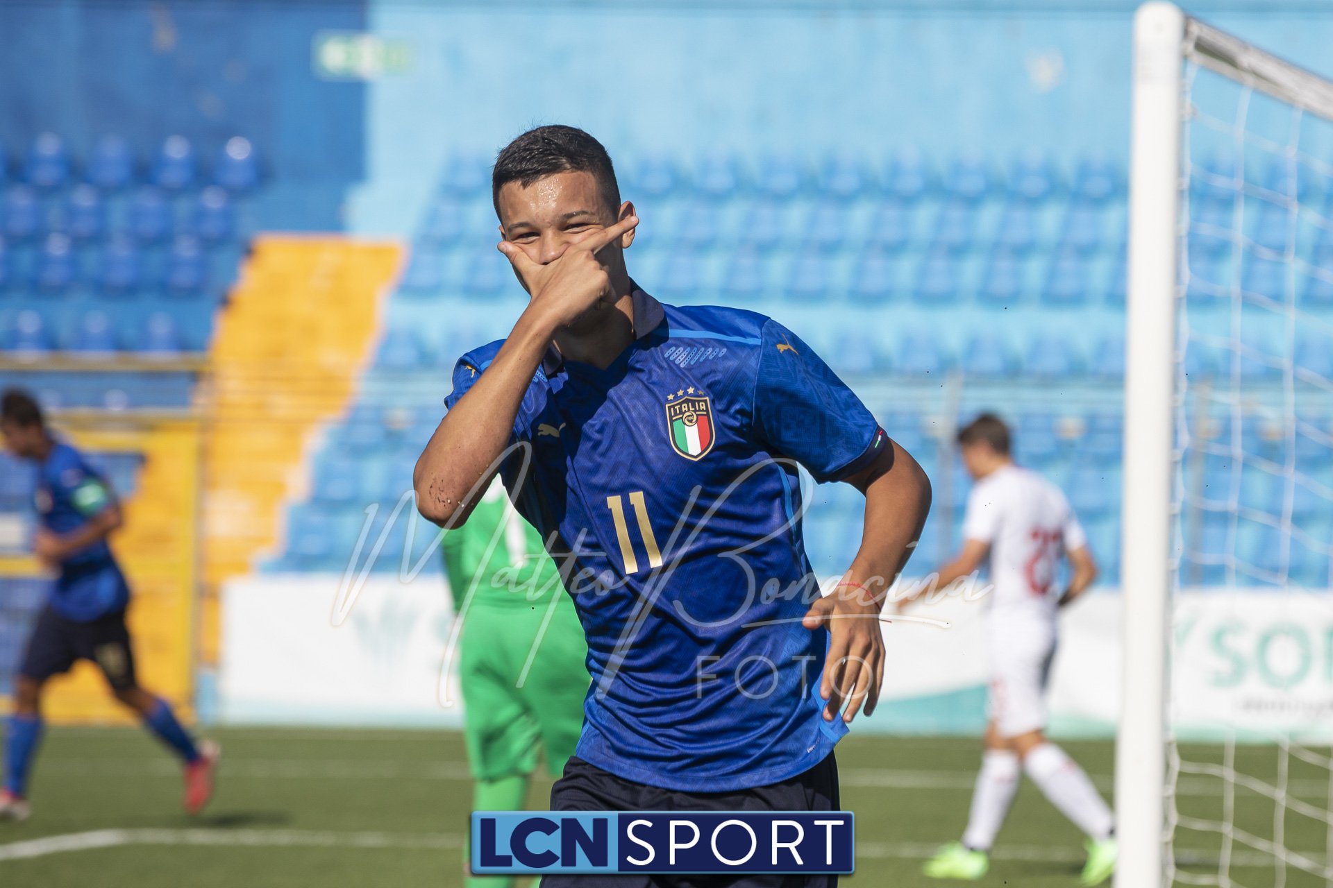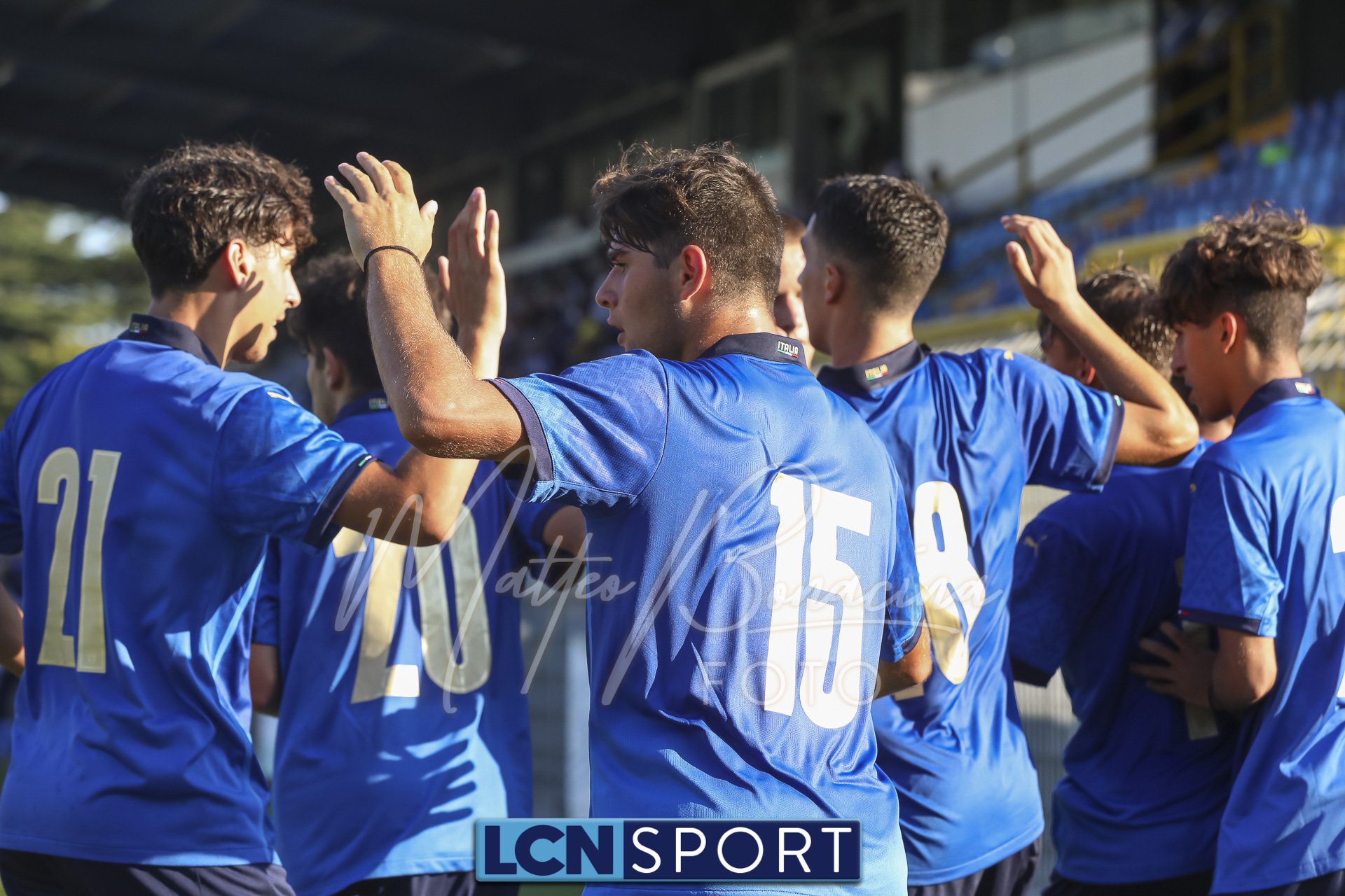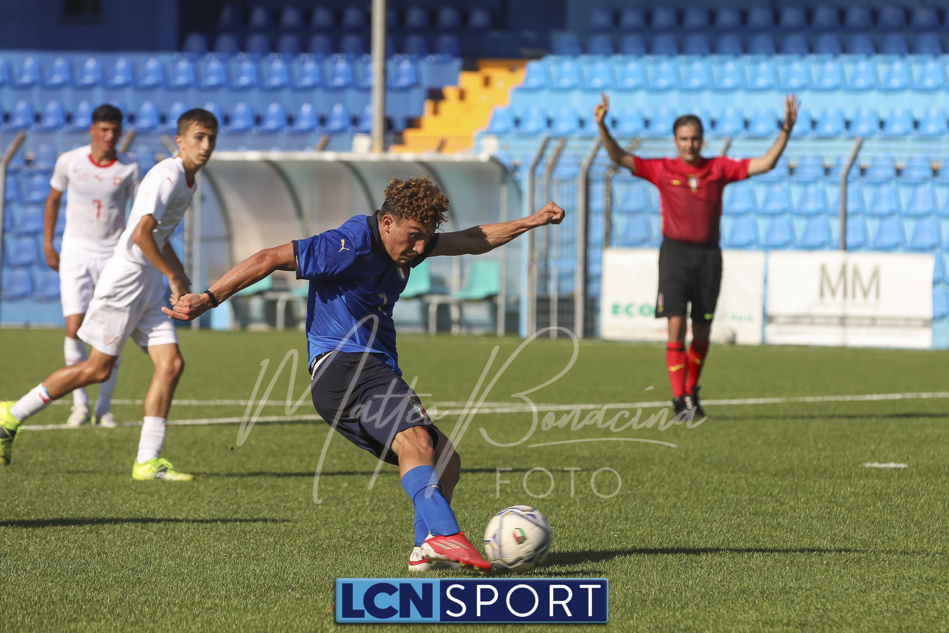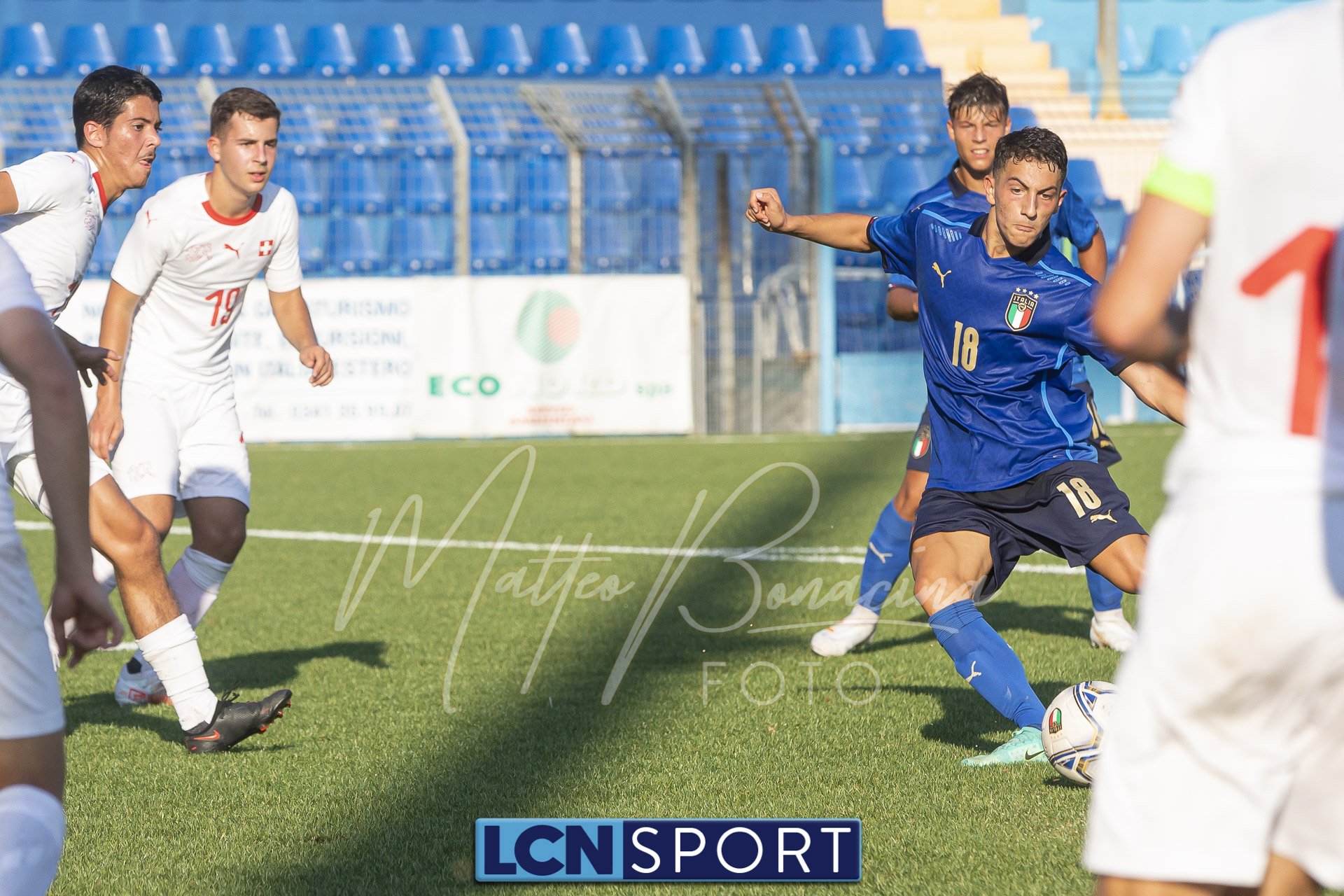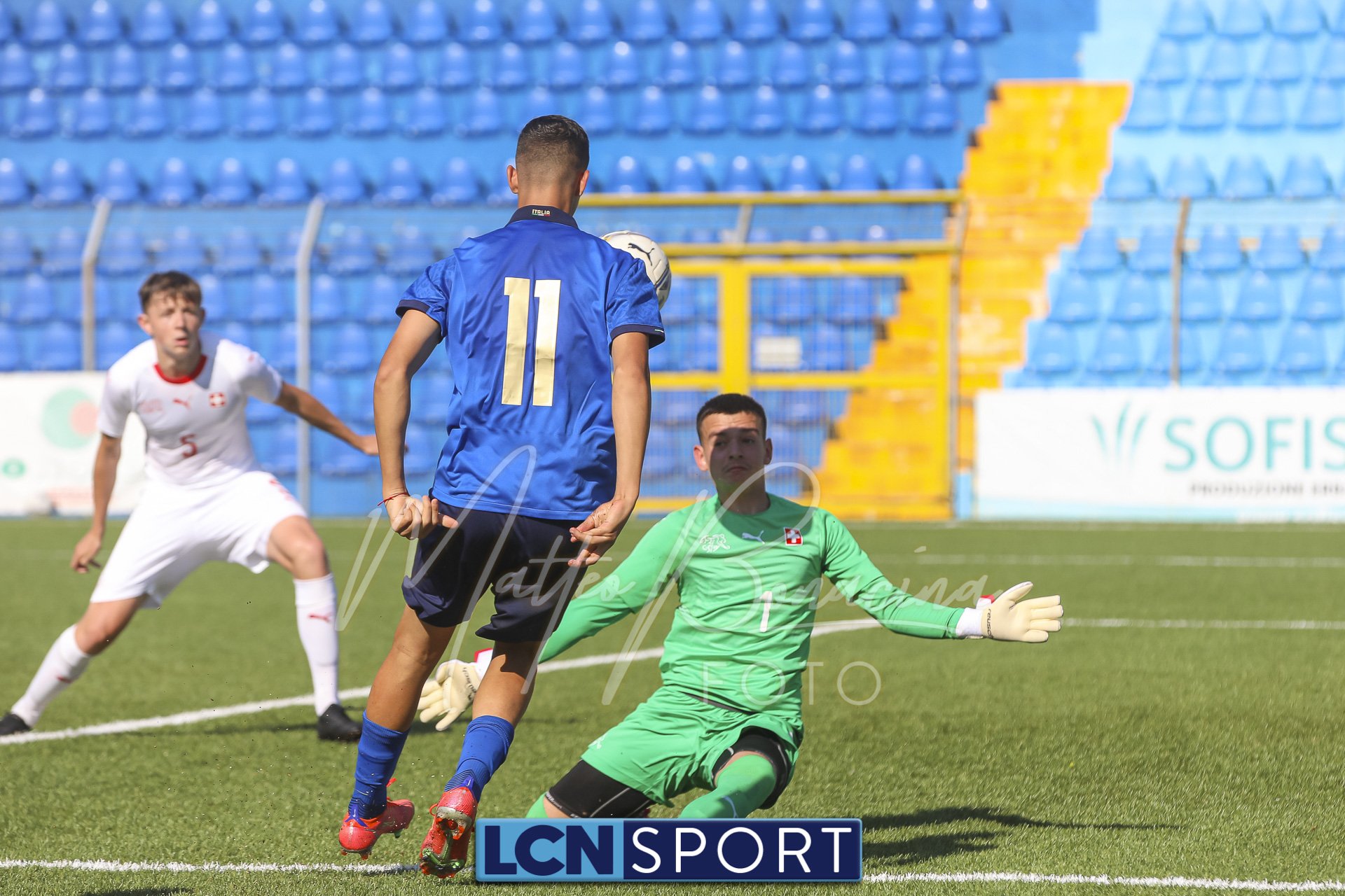 L’Italia parte subito forte e dopo un gol annullato in seguito a un calcio d’angolo e il successivo batti e ribatti in area svizzera, arriva il primo vantaggio con l’interista Valentin Carboni (figlio d’arte, il padre Ezequiel) che all’8’, con un delizioso pallonetto, insacca la porta avversaria. Segue la reazione elvetica che con il suo attaccante Mouta, si rende pericolosa in un paio di occasioni. Ma la difesa azzurra è accorta e gli Azzurrini controbattono fino al 29’, quando arriva il raddoppio: è Di Maggio a realizzarlo, raccogliendo una ribattuta sul tiro del suo compagno di club Carboni e scagliando violentemente il pallone sotto la traversa svizzera. Si va all’intervallo con l’Italia in vantaggio di due gol.