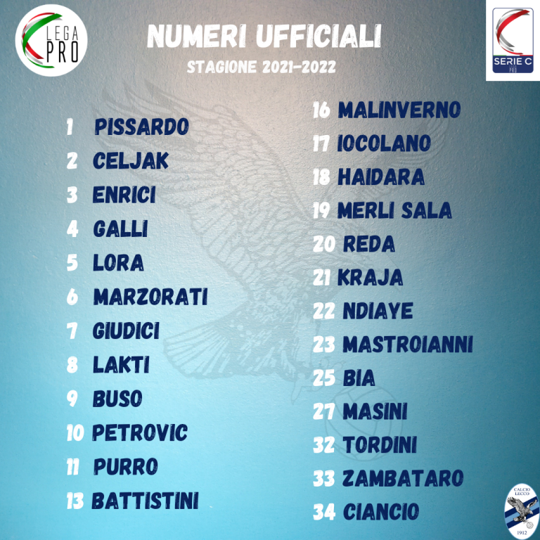 Si va dall'”1″ di Marco Pissardo fino al “34” di Edoardo Ciancio, giovane portiere del 2003 che il Lecco ha rilevato dal Monza e inserito nella rosa della Primavera 3. In mezzo ci sono tutti i numeri blucelesti in vista della stagione 2021/2022: confermati anche il “2” di Celjak, il “4” di Galli, il “5” di Lora, il “6” di Marzorati, il “7” di Giudici, il “17” di Iocolano, il “19” di Merli Sala, mentre cambiano Purro (“11”), Haidara (“18”), Mastroianni (“23”) e Masini (“27”); la “10” va Tomi Petrovic.
