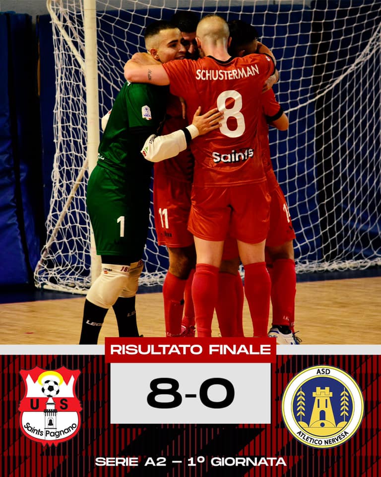 I Saints salutano il pubblico tornato al palazzetto di Merate dopo lungo tempo e lo fanno nel migliore dei modi, strapazzando di reti l’Atletico Nervesa. Apre le marcature Schusterman al 1′, quindi Mauri raddoppia quando sul cronometro sono passati 5 minuti. Ancora Schusterman prima delle fine del tempo per il 3-0. Nella ripresa non c’è partita, vanno in rete due volte Milani (7′ e 8′) quindi dal 15′ si scatena Caglio che in 60 secondi realizza la personale tripletta.