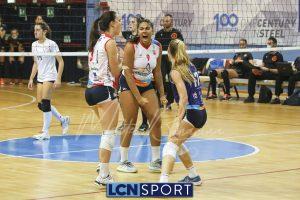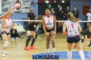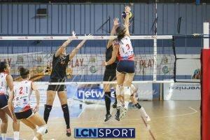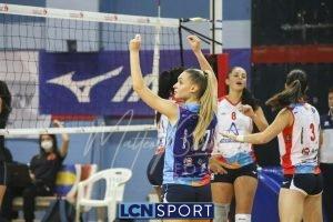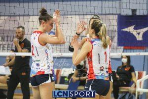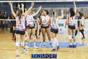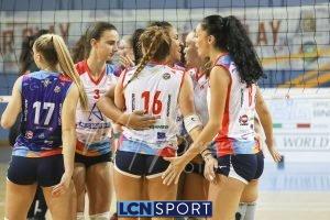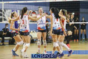 Le biancorosse chiudono con 7 aces, 16 errori da fondo campo, 14 muri messi a segno e una ricezione positiva del 60%.
