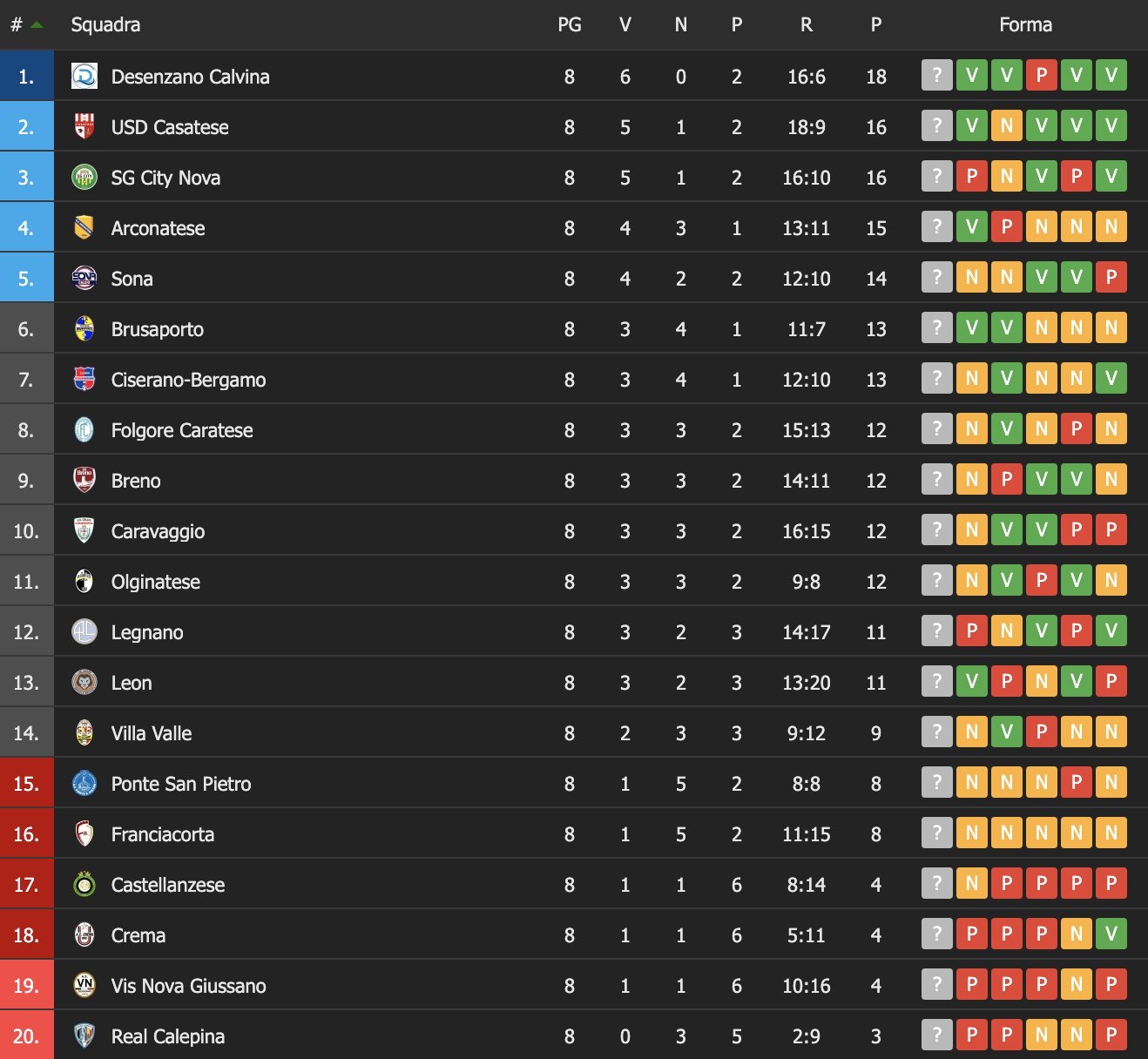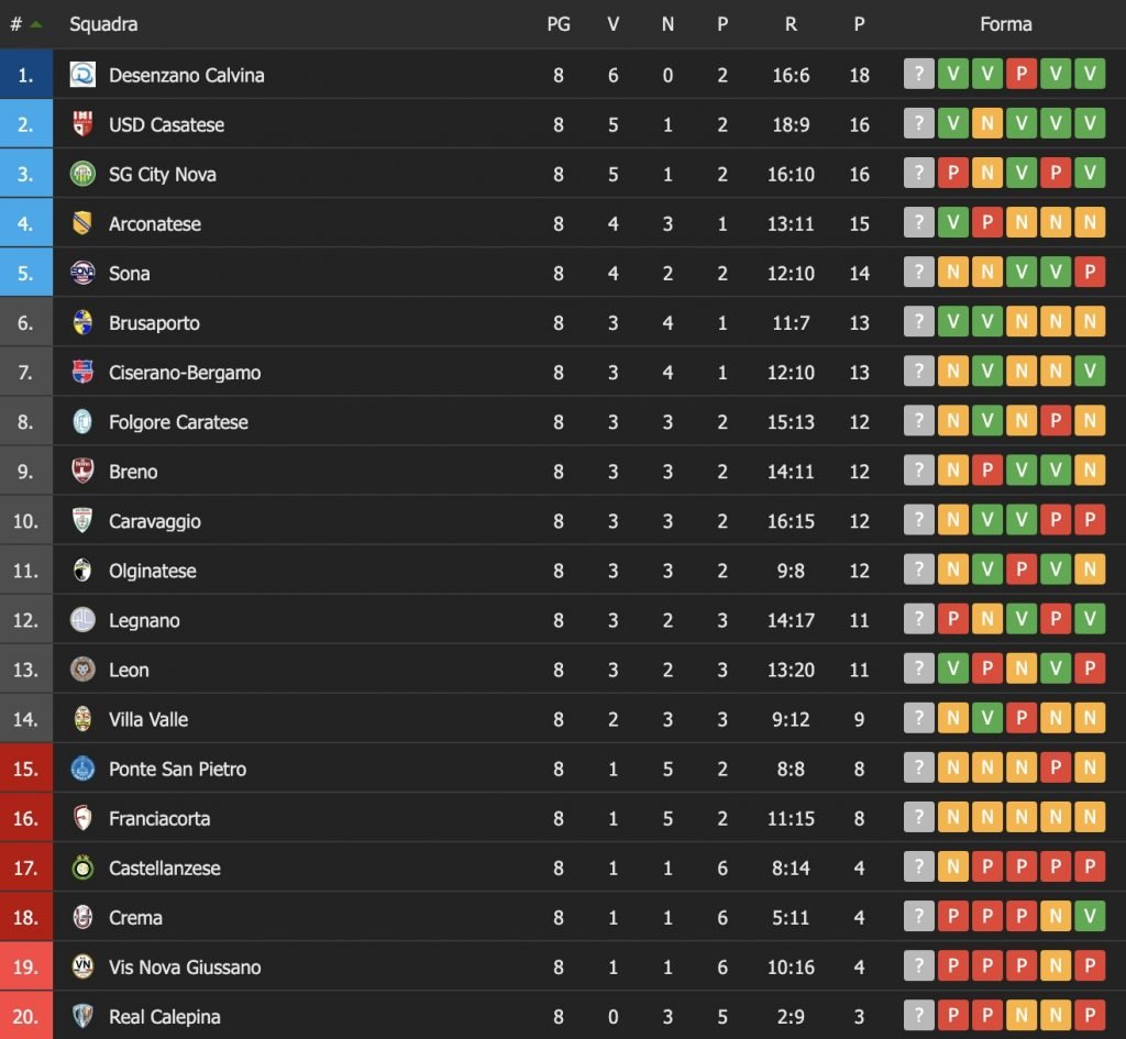 Nuovo buon turno per le lecchesi impegnate in Serie D. Particolarmente positiva la domenica della Casatese, che riceve e batte il pericolante Crema: il sistema difensivo dei bianconeri regge fino a metà della ripresa, poi Fusi trova la via del gol battendo Ziglioli con un bel diagonale e in pieno recupero è il solito Giorgio Recino a conquistarsi e trasformare il calcio di rigore che vale il raddoppio. Tre punti che valgono il secondo posto alla squadra di mister Achille Mazzoleni insieme al San Giuliano City Nova, battutto sul sempre insidioso campo del Brusaporto e penalizzato dalla sconfitta nello scontro diretto accusata qualche settimana fa. Buon pari, invece, per la Brianza Olginatese di mister Giovanni Arioli: le due compagini, appaiate in classifica, creano pochino e non riescono a sbloccare il match, dividendosi la posta in palio e mantenendosi lontane dalle zone più calde della graduatoria. Sarà, come da classica turnazione, proprio il Breno a ricevere la Casatese domenica 31 ottobre, mentre i bianconeri giocheranno in casa con il Brusaporto: cambia l’orario, con calcio d’inizio fissato alle 14.30.