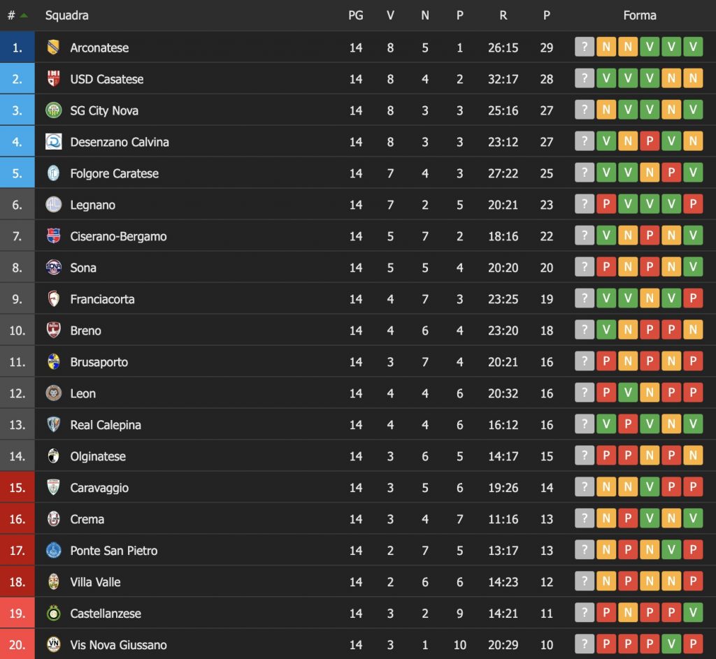 È ancora la Casatese a ridere nel fine settimana di Serie D. I biancorossi guidati da mister Achille Mazzoleni vincono sull’insidioso campo del Sona e si regalano una notte, quella tra sabato e domenica, in vetta alla classifica di quarta serie: il pareggio ottenuto dall’Arconatese a Ponte San Pietro ricaccia indietro i brianzoli, che comunque vedono a portata di mano il sorpasso ai danni dei milanesi. In Veneto decidono la seconda rete stagionale di bomber Mattia Isella e la stoccata sugli sviluppi di un calcio d’angolo piazzata da Joel Aubin Videkon. Sorride decisamente meno la Brianza Olginatese di mister Giovanni Arioli, a secco di vittorie ormai da 20 ottobre (Crema 0-1 Brianza Olginatese): i bianconeri e la Virtus CiseranoBergamo danno vita a un match gradevole, che Bardelloni e Belloli risolvono nella ripresa; la zona play out, nonostante una partenza più che positiva, ora incombe.