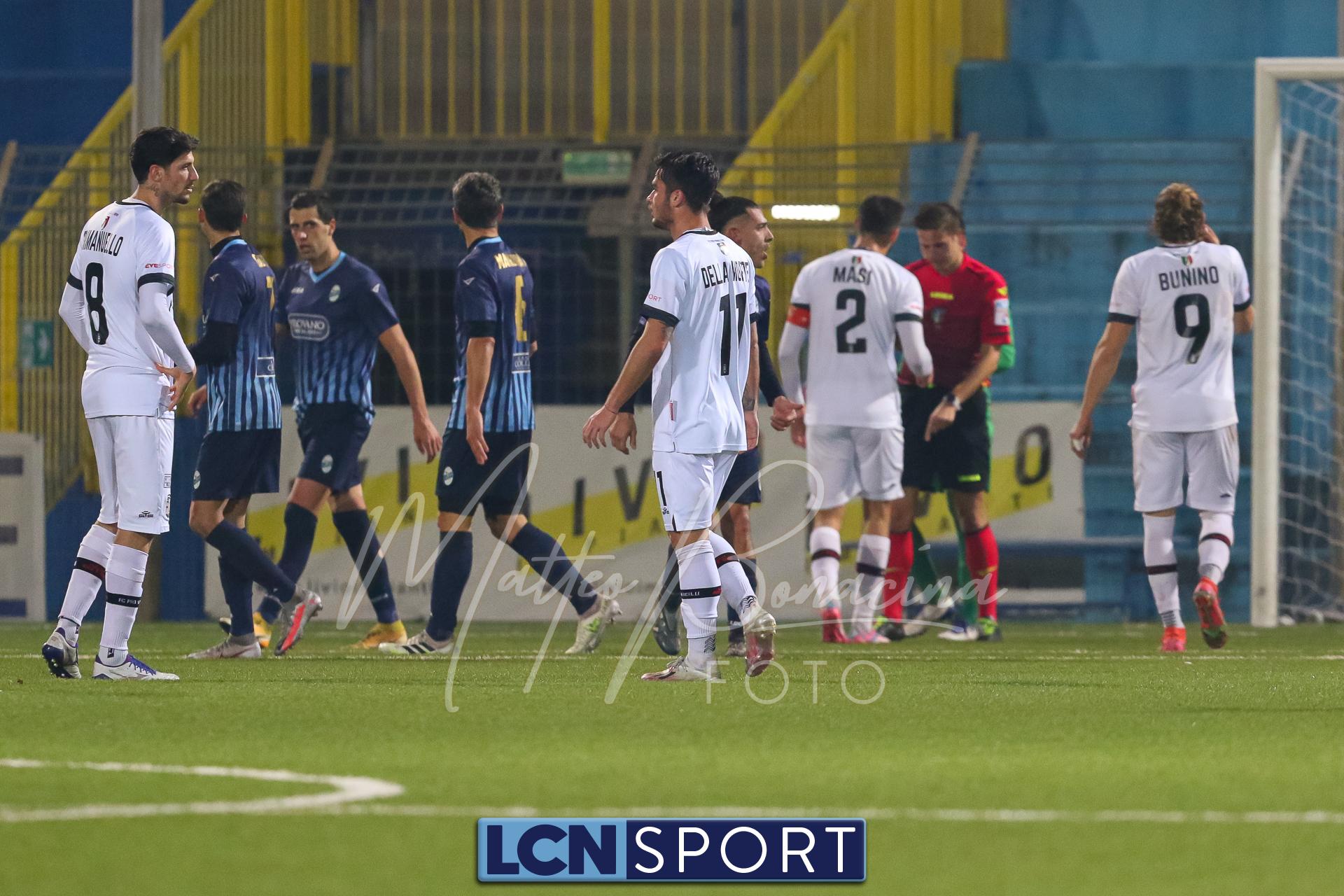 Kraja, pescato sul filo del fuorigioco da Zambataro, calcia di mezzo esterno col destro, la palla spiove e colpisce l’incrocio dei pali. Gol annullato alla Pro Vercelli al 20′ dopo il tiro da punizione di Emmanuello, conclusione di Della Morte deviata da un compagno oltre la linea. Subito occasionissima per Iocolano servito da Giudici, destro fuori di poco. Vitale conclude al 23′ col mancino, lontano dai pali. Sempre da destra, palla dentro per Petrovic che calcia di prima intenzione, Valentini ci mette i guantoni. Al 35′ spunto di Della Morte a sinistra, tiro forte che Pissardo, non fidandosi, devia in angolo. Zambataro da sinistra smista bene per l’accorrente Petrovic che “mastica” un po’ il pallone di sinistro, non trovando la porta. Kraja prova un destro a giro “telefonato” al 42′, centrale per Valentini. Tiro al volo di Zambataro, conclusione un po’ sporca deviata in corner dal portiere. E il tempo finisce.