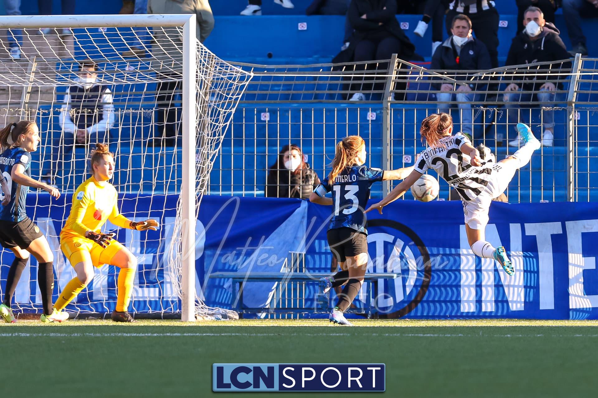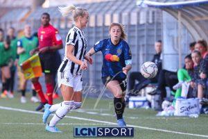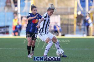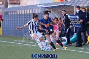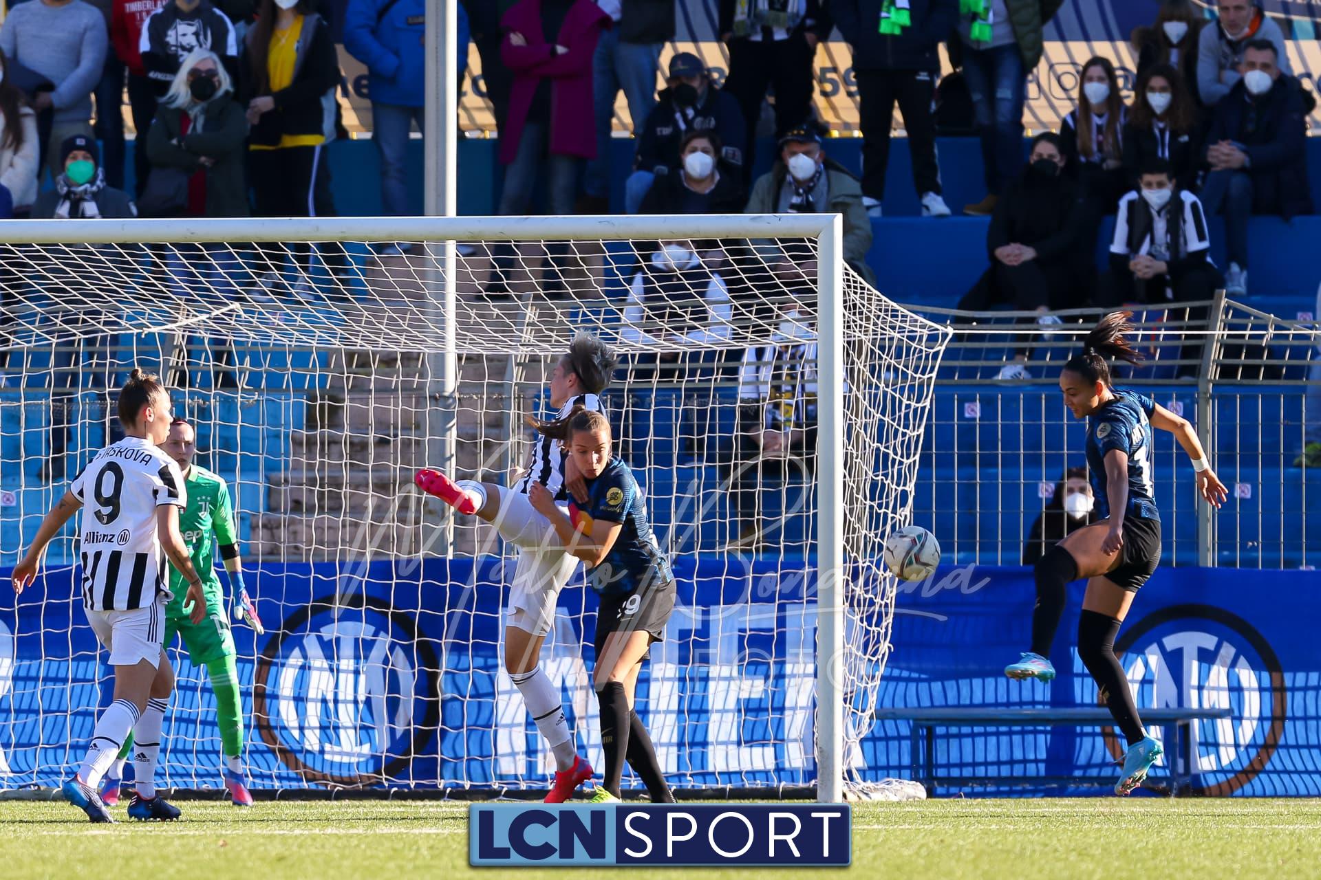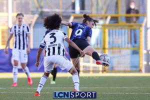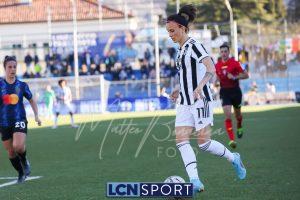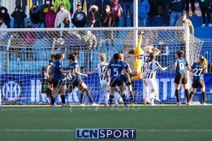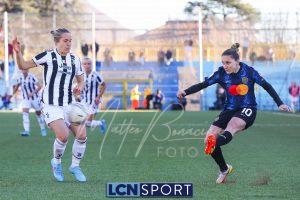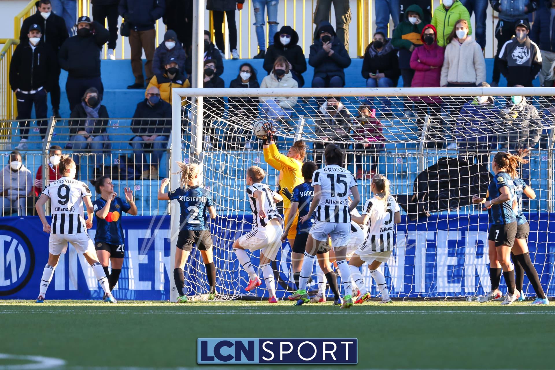 A cavallo del 20′ arriva la più grande occasione del primo tempo. Sugli sviluppi di un calcio d’angolo, Staskova prende il tempo a tutte e gira in porta di testa a botta sicura, ma Merlo, appostata sulla linea, respinge. Il classico intervento che, si dice, vale sostanzialmente un gol. La Juve vuole sfruttare l’occasione per mettere ulteriore pressione all’Inter e al 27′ è Lundorf, servita da una bella giocata di Staskova, a sfiorare li vantaggio: il suo destro colpisce il palo esterno. Il resto del primo tempo scivola via tra tanti duelli, con a far eccezione lo spunto di Njoya al 31′. Parata facile per Peyraud-Magnin.