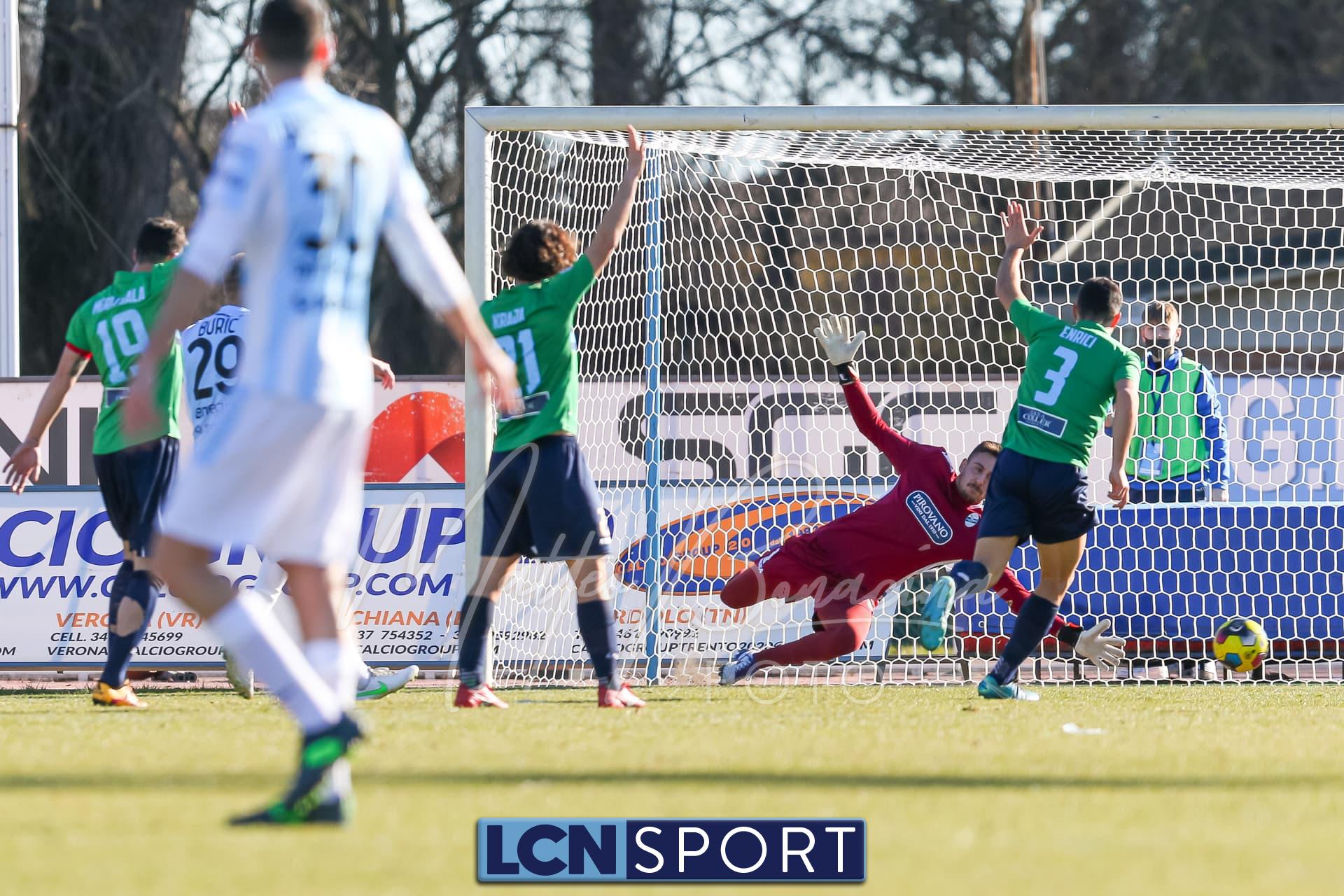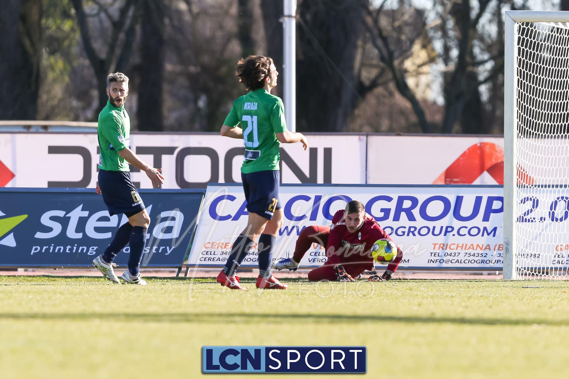 Occasionissima al 29′ per il Legnago con Buric che va fino in fondo e mette il pallone a rimorchio per Contini: controllo e tiro per fortuna “strozzato”. Subito dopo prodezza di Pissardo su brutta palla persa davanti all’area: il portierone bluceleste si butta a terra e sradica il pallone dai piedi di Contini lanciato a rete. Al 39′ il vantaggio dei padroni di casa: l’incontenibile Buric calcia una punizione dai 25 metri a mezza altezza, Pissardo si tuffa ma può solo sfiorarla. Nel finale di tempo il Lecco prova a riaffacciarsi avanti sfruttando due calci d’angolo, ma Merli Sala non riesce a concretizzare.