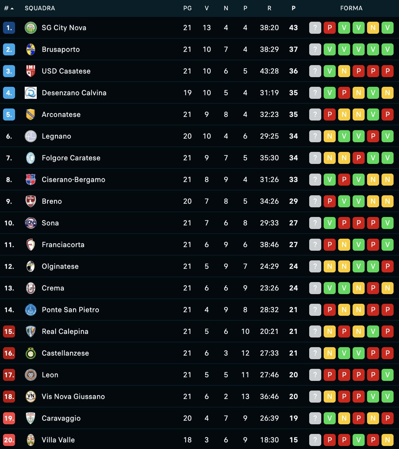 Una vittoria del genere era impossibile da pronosticare. Dopo i segnali di risveglio dati con l’Arconatese, la Casatese di mister Achille Mazzoleni si scrolla di dosso il periodo di grande difficoltà e demolisce il Franciacorta, a inizio anno inserito tra le squadre che avrebbero dovuto lottare per le posizioni di prestigio: invece in terra bresciana arriva un pokerissimo inferto già al termine della prima frazione, complice anche la prematura espulsione (11′ pt) di Felipe Sodinha, grazie alla doppietta di bomber Mattia Isella, restato in Brianza nonostante la serrata corte della Pro Sesto (Serie C), alle reti di Pietro Fusi, Simone Pontiggia e all’autogol di Berna. Solo alla mezz’ora della ripresa i biancorossi hanno concesso a Patarini l’opportunità di bucare Pirola per il gol della bandiera. Buon punto esterno, invece, per la Brianza Olginatese per l’imbattuto mister Aldo Monza: sul campo della pericolante Real Calepina arriva un pareggio a reti bianche che permette ai neopromossi bianconeri di mantenere tre punti di distanza dalla zona play out.