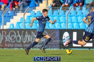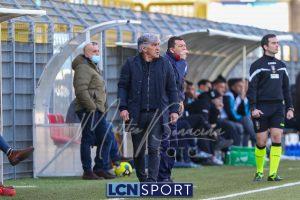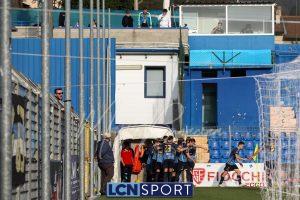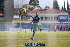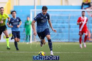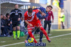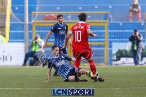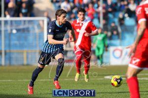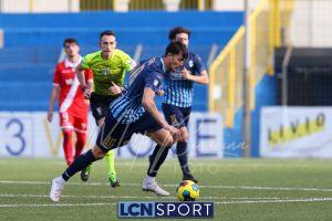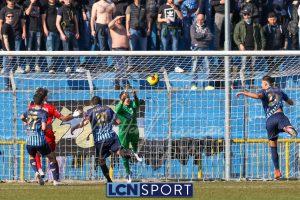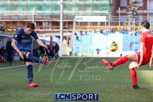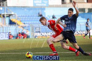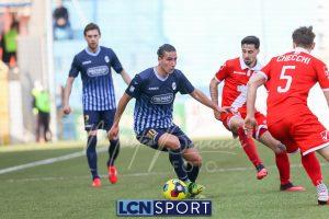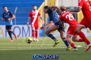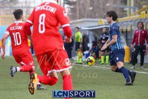 Ritmo basso all’inizio. Al 5′ ci prova Bruccini che vince un paio di rimpalli e tenta di calciare, alto di poco. Altro tentativo al 10′, dagli sviluppi di calcio di punizione, conclusione da fuori area di Militari, non di molto a lato. Il Lecco reagisce al 16′: cross dalla sinistra di Buso, Ganz si avvita e la sfiora, Marone non si fida ed è costretto a metterla in angolo. Al 24′ grande giocata di Buso, che si libera di un avversario con una finta, entra in area e tira su Marone. Insistono i blucelesti: cross dalla destra di Giudici, tentativo di testa di Nepi, respinge la difesa quasi sulla linea; sulla ribattuta sforbiciata di Buso bloccata da Marone. Ancora Nepi in gioco aereo alla mezzora, su punizione di Giudici: non di molto alto sopra l’incrocio dei pali.