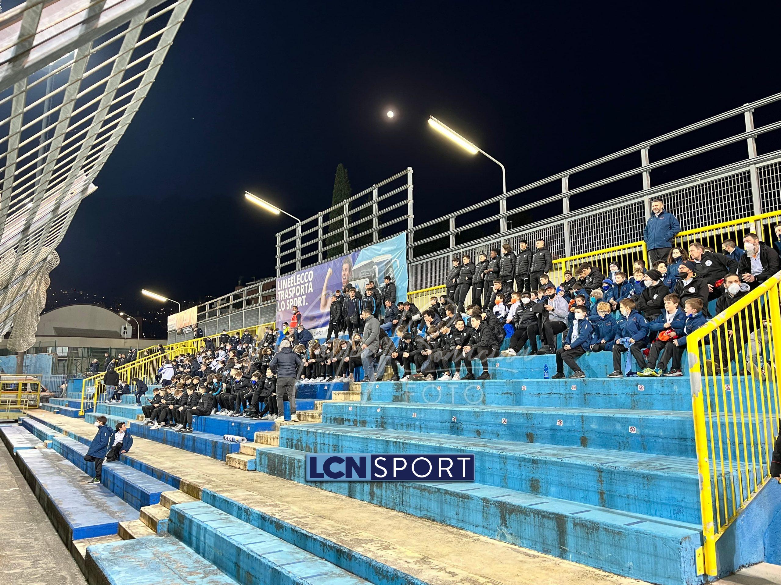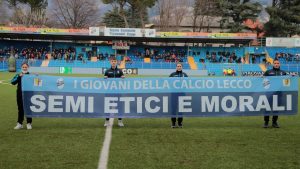 La serata di Lecco-Juventus U23 ha fatto centro. In campo, certo, con la doppietta di Simone Andrea Ganz, ma anche fuori dal rettangolo verde. In Curva Sud si sono assiepati tra più di duecento giovanissimi calciatori blucelesti e delle società amiche, che sono stati salutati prima del calcio d’inizio dal patron Paolo Leonardo Di Nunno e dal direttore generale Angelo Maiolo. Poi, quattro di loro sono entrati in campo e hanno sfilato portando lo striscione recante la scritta “I giovani della Calcio Lecco: semi etici e morali”. Alla fine dell’incontro la squadra al gran completo si è recata sotto al settore per salutare i giovani atleti e tifosi: la cornice di pubblico è stata adeguata all’occasione, con 1.129 spettatori totali tra paganti (790) e abbonati (339), cui va sommato proprio il corposo gruppo che ha trovato posto all’interno di quella che è generalmente la zona destinata agli ospiti. L’iniziativa young proseguirà anche in vista delle gare con Trento, Piacenza e Seregno.