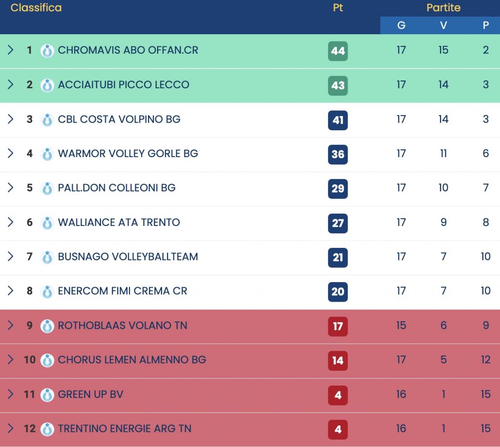 Prosegue la lotta in vetta al campionato di Serie B1. Lotta che diventa praticamente una corsa a tre dopo il netto successo (3-0) della Chromavis Abo Offanengo contro la Warmor Gorle. L’AcciaiTubi Pallavolo Lecco Alberto Picco fa appieno il proprio dovere, superando l’insidia Chorus Lemen nel giro di un’ora abbondante: al “Bione” la giovanissima squadra bergamasca conferma i propri limiti e rimane ad ampia distanza dalla zona salvezza. Le biancorosse, invece, si fanno portare ai vantaggi durante il secondo set, ma incontrano ben pochi ostacoli all’interno degli altri due parziali. E scatta l’ora del debutto anche per la giovani Vittani, aggregata da inizio anno alla rosa lecchese. Picco Lecco che chiude con 7 battute vincenti, 9 battute sbagliate, ben 9 muri 9, il 36% in attacco, e il 60% in ricezione positiva.