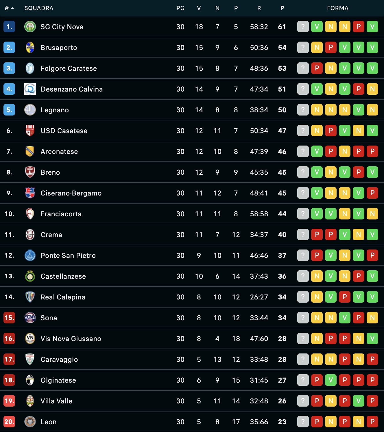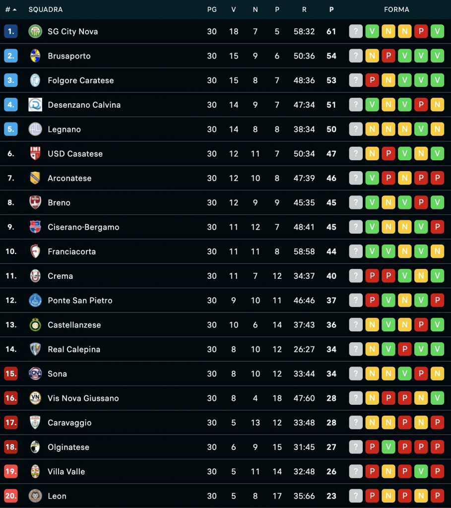 Subito in campo dopo il derby vinto dalla Brianza Olginatese sulla Casatese nel fine settimana. I bianconeri, tornati ad assaporare il dolce gusto dei tre punti dopo due pareggi e sette sconfitte di fila, sono stati battuti dalla corazzata Desenzano Calvina: vantaggio-lampo per i padroni di casa con Aliù, poi Colnago respinge il rigore del potenziale 2-0 calciato da Marangon, quindi pareggia Viganò a ridosso del 45′ sugli sviluppi di una punizione laterale. I lecchesi nella ripresa tengono botta sotto la pressione dei bresciani, ma a un quarto d’ora dalla fine Giani gira in porta un pallone piovuto in area da calcio d’angolo e fa sfumare il punto. Gara sugli scudi per la Casatese, costretta a sbattere contro il muro eretto dal Brusaporto secondo in classifica: tante occasioni per entrambe le squadre, ma vuoi Ferrara e Aceti, vuoi un po’ d’imprecisione, alla fine il risultato non si sblocca e divide la posta in palio.