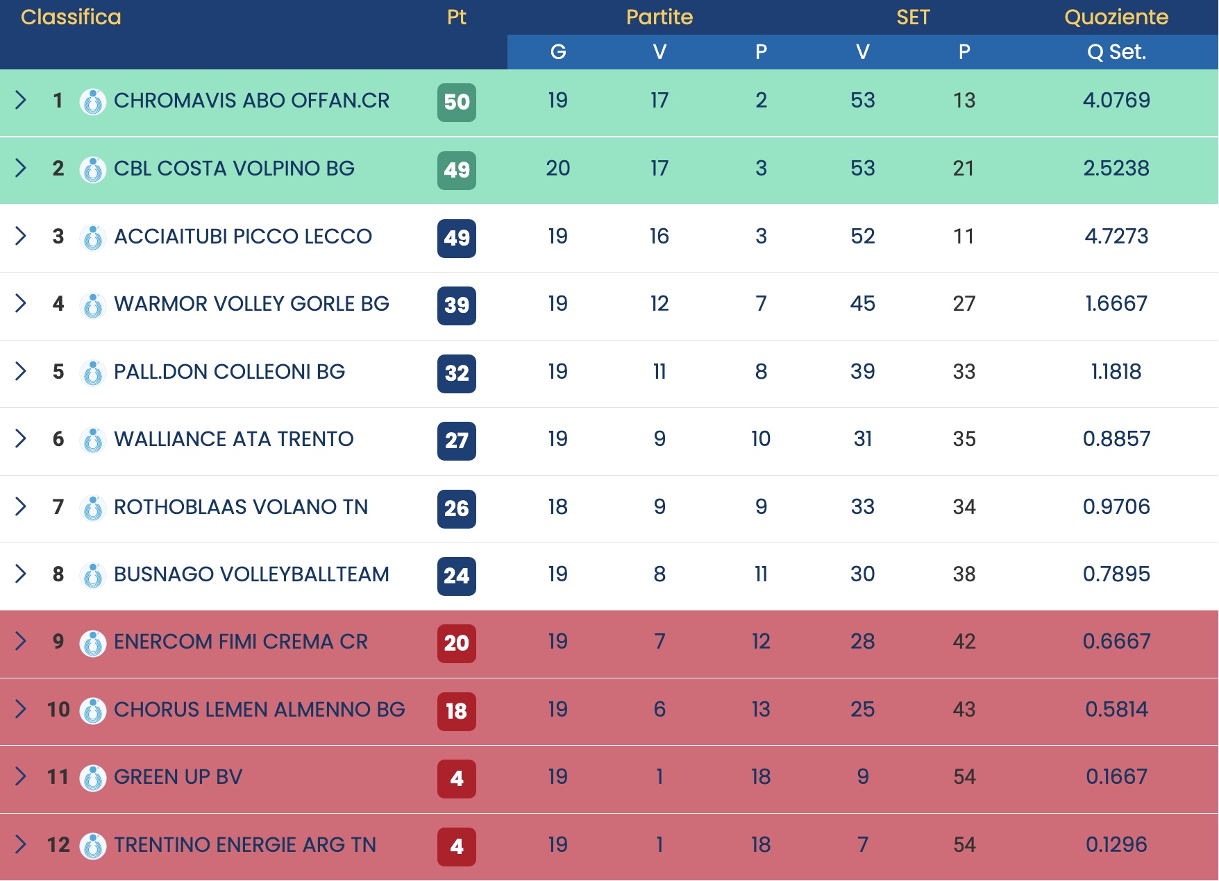 La risposta deve arrivare subito. Nell’anticipo di giovedì sera Cbl Costa Volpino ha superato agevolmente, come da pronostico, la Green Up di Bedizzole, garantendosi l’accesso almeno temporaneo al secondo posto che vale un posto nella griglia dei play off promozione. A farne le spese è stata l’AcciaiTubi Picco Lecco, che paga le due sconfitte patite negli scontri diretti e stasera (ore 21) dovrà fare punti sul campo della Warmor Gorle. Partita forte, con tanto di contestata vittoria al “Bione” nella gara d’andata, la compagine bergamasca ha accusato qualche passo farlo di troppo, perdendo definitivamente il treno degli spareggi con la sconfitta di Volano. Con tre sole gare da giocare, con tanto di scontro diretto sul campo della capolista Chromavis Abo Offanengo a chiudere la stagione regolare, le biancorosse non possono permettersi di lasciare punti per strada.