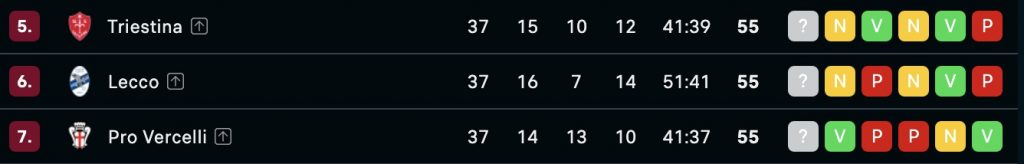 - Lecco settimo se chiude con meno punti di entrambe o se fa meno punti della Triestina nell’ultimo turno e chiude alla pari con la Pro Vercelli.