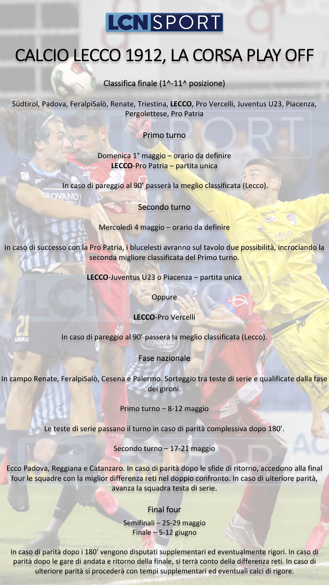 Quarta partita di fila senza il sapore della vittoria per la Calcio Lecco 1912. I blucelesti stanno conoscendo il secondo momento di difficoltà della stagione proprio quando è arrivato il gran finale e questo ha impedito di centrare il quinto posto conclusivo: sarebbe stato il miglior piazzamento dal 1977 in avanti, ma soprattutto avrebbe garantito la possibilità di saltare la prima partita all’interno dell’infinita bagarre dei play off promozione. Le Aquile (6^) scenderanno in campo subito, domenica 1 maggio a un orario ancora da conoscere, per affrontare gli eterni rivali della Pro Patria (11^), che sono saliti sull’ultimo vagone del treno grazie alla contemporanea presenza di Südtirol, promosso in Serie B, e Padova in finale di Coppa Italia di categoria. Il prossimo fine settimana scenderanno quindi in campo sei squadre, mentre la Triestina lo farà il 4 maggio per incrociare la peggiore classificata tra quelle che supereranno il primo ostacolo.