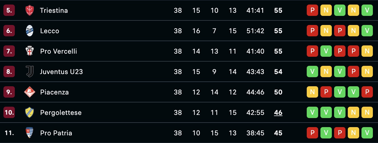 oppure - Juventus U23 (8^) o Piacenza (9^)-Pergolettese (10^)