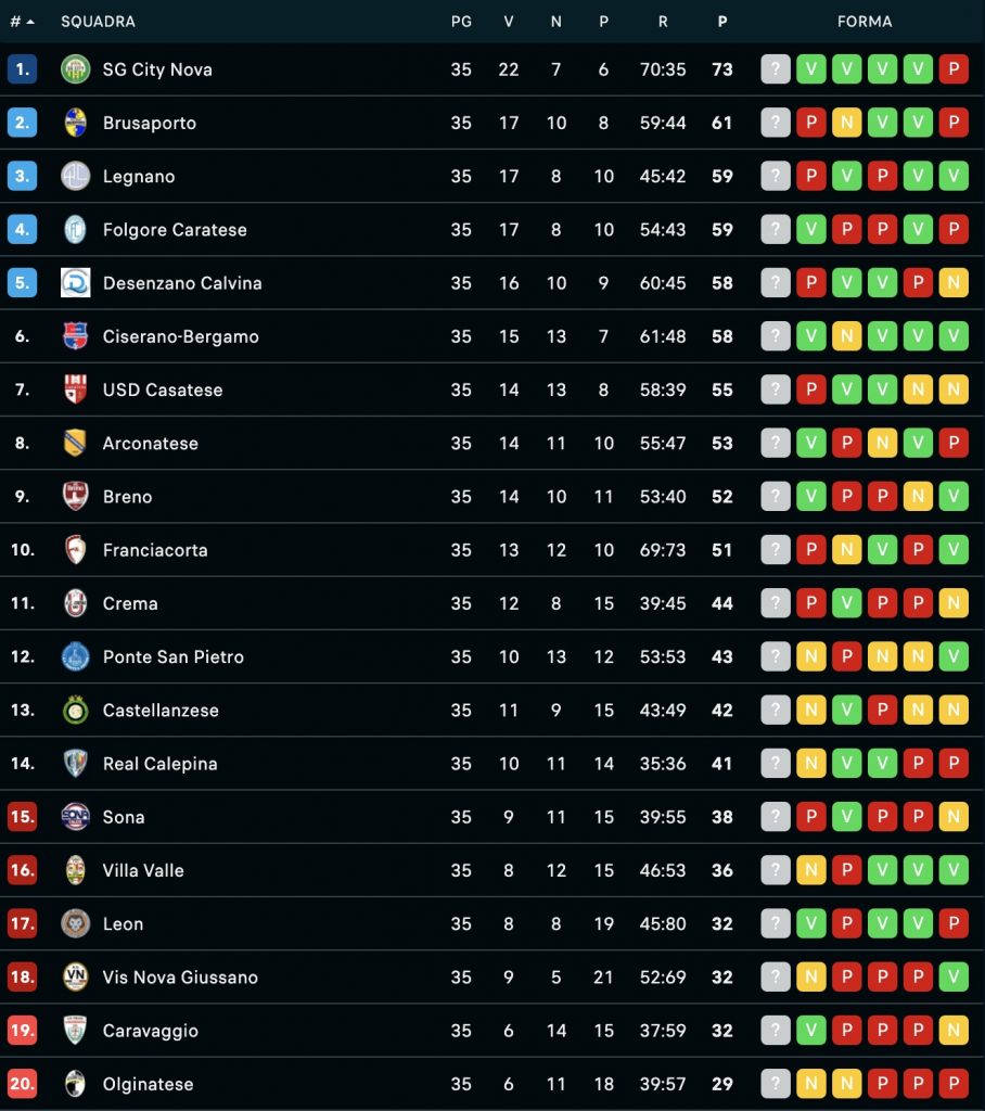 Turno di fondamentale importanza in Serie D. Il San Giuliano City Nova conferma i pronostici iniziali e conquista con largo anticipo la promozione in Serie C grazie al roboante 1-5 rifilato in trasferta al Franciacorta: grande soddisfazione per gli ex Lecco Bonadeo, Marotta e Ferrario. Scivolone pericoloso, invece, per la Casatese di mister Achille Mazzoleni, che sul campo della Folgore Caratese perde uno scontro diretto di grande importanza per provare a riacciuffare la zona play off: decide Sevo Ciko a poco più di un quarto d’ora dal triplice fischio. Capitale enorme quello gettato al vento dalla Brianza Olginatese: i bianconeri impattano bene il primo tempo sul campo del Vis Nova Giussano (1-1 al 45′, gol di Momentè e Fall), poi nella ripresa mettono il turbo e si portano sul doppio vantaggio grazie alla doppietta di Matteo Momente e alla stoccata di Timothy Ekuban; non basta per avere ragione dei padroni di casa, ora terzultimi, che rimontano con Mancosu e Calmi nel giro di due minuti (79′ e 81′). La squadra di Simone Boldini guarda ancora tutti dal basso verso l’alto a tre turni dalla fine.