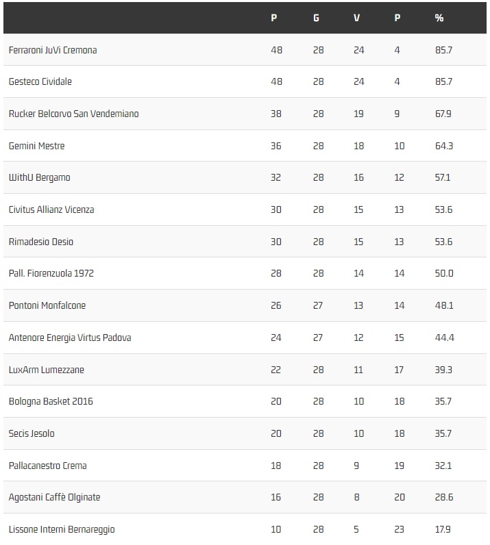 L’unica vera certezza è la retrocessione aritmetica di Bernareggio in C Gold. Le prime otto squadre classificate disputeranno i play-off: Cremona e Cividale si contendono il primo posto, San Vendemiano e Mestre la terza piazza. Agli spareggi promozione anche Bergamo e Desio, mentre Vicenza, battendo Monfalcone sabato, può chiudere i conti. Fiorenzuola, la stessa Monfalcone e Padova si contendono l’ultimo posto.