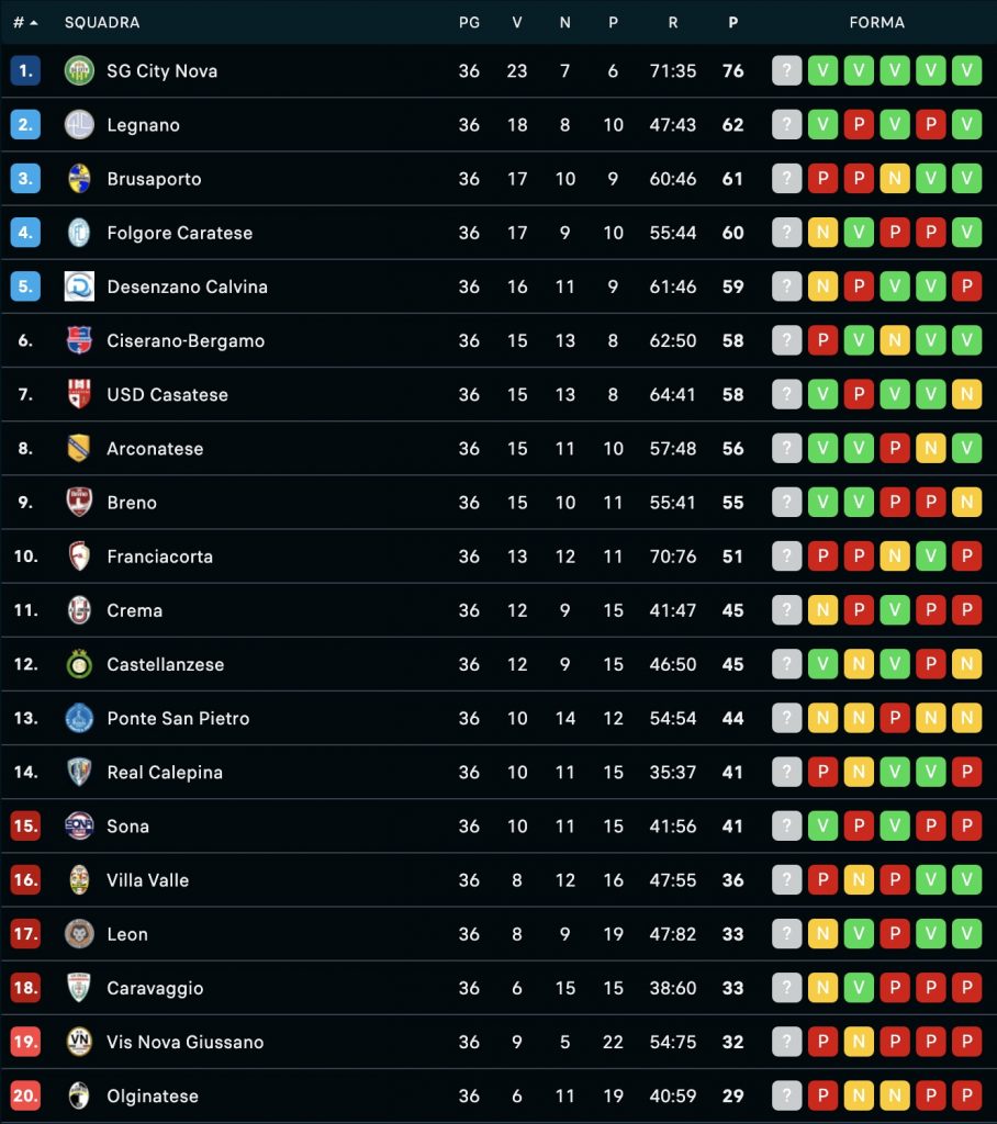 Si avvicina la conclusione della stagione regolare di Serie D. In quarta serie eccelle la Casatese, che infligge un pesantissimo 6-2 al Vis Nova Giussano e alza nuovamente la pressione in zona play off dopo la sconfitta patita nel turno infrasettimanale con la Folgore Caratese. I biancorossi guidati da mister Achille Mazzoleni hanno letteralmente dilagato nello scontro di Casatenovo nonostante un primo tempo conclusosi incredibilmente sul risultato di 0-0. Poi, ecco l’apertura firmata Menegazzo, il pareggio di Beretta, il nuovo vantaggio firmato Fusi, la fuga sulle ali di capitan Sassella, l’intermezzo dell’ex Gambazza, la doppietta su calcio di rigore di bomber Recino (16 gol stagionali) e la chiusura del set affidata a Comberiati, Otto gol in quaranta minuti, dal 3′ al 43′ della ripresa. Situazione decisamente più complessa per la Brianza Olginatese di mister Simone Boldini, alla quale servirà un miracolo, ancor più che un’impresa, per mantenere la categoria. I bianconeri ci hanno provato anche con il Sona, portandosi in vantaggio con il solito Matteo Momentè (20′ pt); niente da fare, però: i veneti hanno rimontato completamente con Angelini (28′ pt) e Strianese (22′ st). Ai lecchesi potrebbero non bastare nemmeno due vittorie con le dirette avversarie Villa Valle e Leon per centrare i play out.