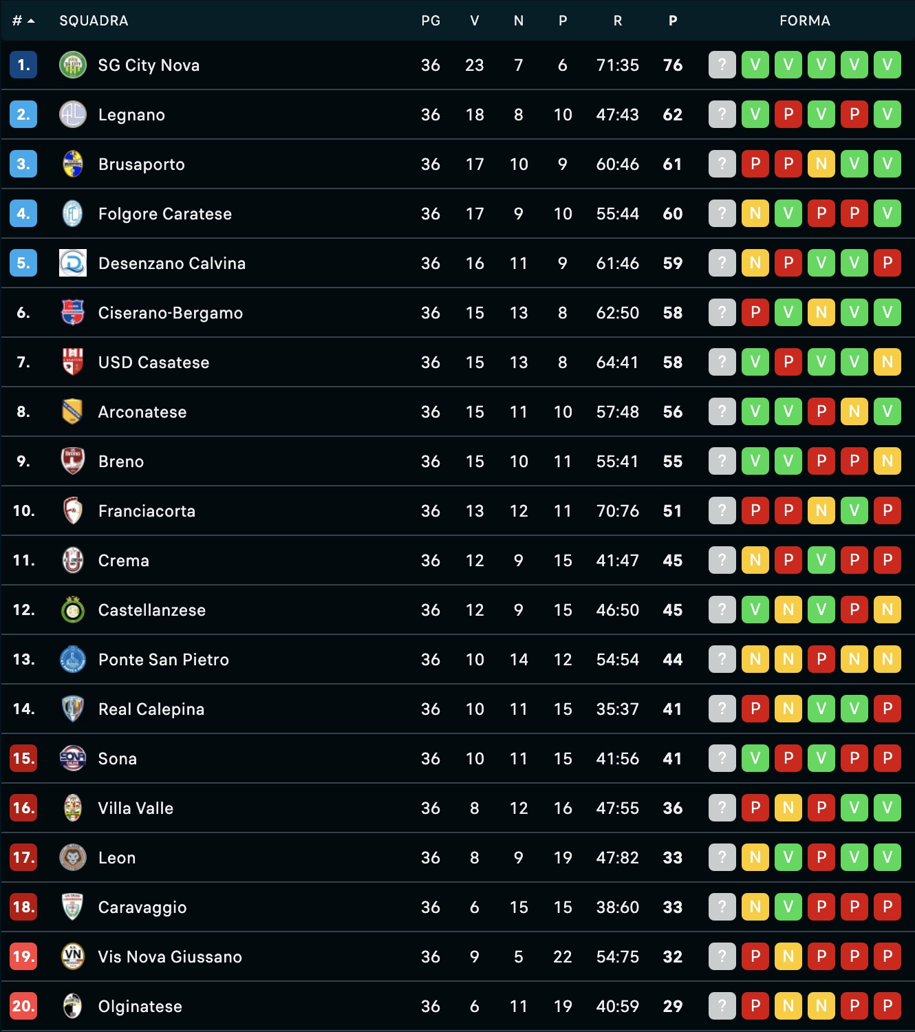 I risultati del 36° turno