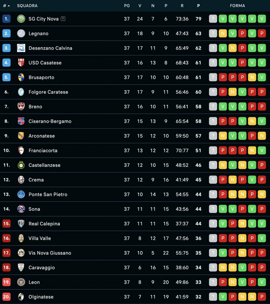 Pomeriggio di fondamentale importanza in Serie D. Il penultimo turno di campionato ha dato risposte parziali, ma comunque molto importanti. La Casatese di mister Achille Mazzoleni ha fatto bella mostra di sè sul campo del pericolante Leon, ma reduce da un momento di buona forma, sbloccando la situazione a metà primo tempo con Pietro Fusi (29′ pt) e giocando poi sul velluto: ancora Fusi (31′) e bomber Mattia Isella (42′) per il tris già al duplice fischio; i padroni di casa provano a rientrare con Andrea Ferrè (26′ st), ma una bella incornata dello stesso Isella (43′, 7° gol in campionato) chiude le porte al potenziale rientro della squadra locale, ancora in rete su calcio di rigore. I biancorossi, che durante l’ultima giornata ospiteranno la Virtus CiseranoBergamo, possono addirittura ambire a un piazzamento finale al secondo posto. Forti emozioni per la Brianza Olginatese di mister Simone Boldini, che vince all’ultimo secondo sul campo del Villa Valle e tiene in piedi le speranze di poter arrivare in zona play out: decide la zuccata di Luca Fischetti, prima e unica occasione da gol dei bianconeri. Gli ultimi 90′ con il Leon potrebbero valere tutto o niente per entrambe: occhio anche alla necessità di ridurre il distacco di otto punti tra la 15^ e la 18^ forza del girone, distanza che impedirebbe la disputa degli spareggi salvezza. Servirà un’altra, grossa impresa.