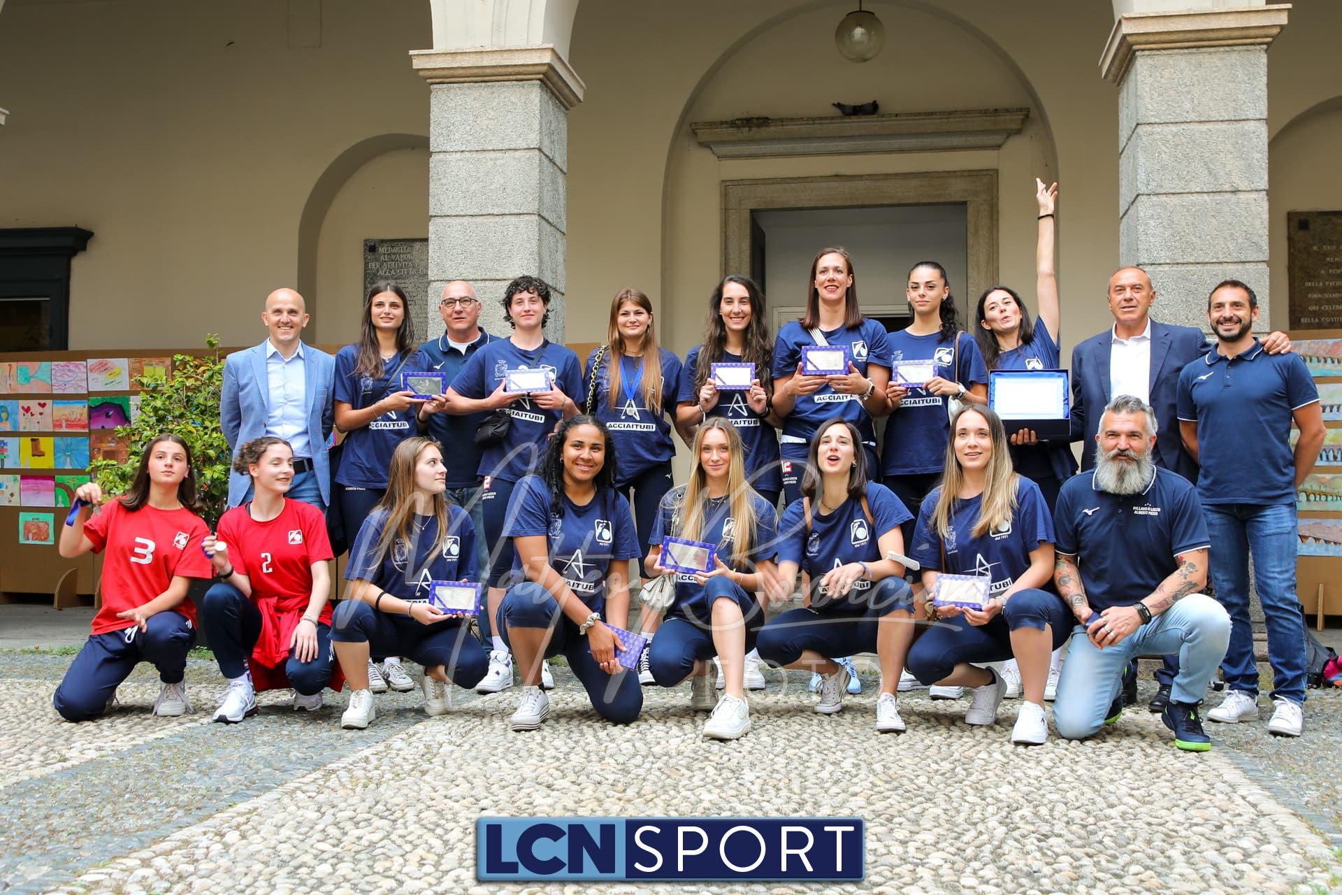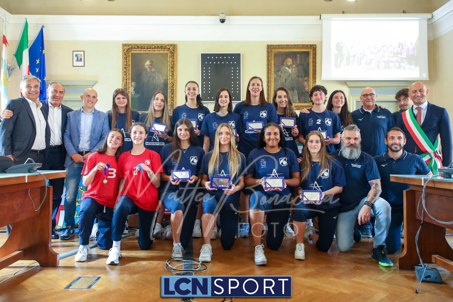 Altro piccolo momento di festa per la Pallavolo Lecco Alberto Picco. Questa volta decisamente più contenuta e dai toni istituzionali, visti contesto e copartecipanti. La Prima squadra biancorossa targata AcciaiTubi, main sponsor rappresentato in sala dal titolare Marco Berera, ha conquistato ormai da una decina di giorni la promozione in Serie A2, un traguardo inseguito per più di un biennio e centrato grazie a una grandissima fase finale, che ha permesso di schiantare con merito Capo d’Orso Palau, che ora se la vedrà con la Chromavis Abo Offanengo per tentare nuovamente l’assalto alla cadetteria. Questa volta sono stati il sindaco di Lecco Mauro Gattinoni e l’assessore Emanuele Torri a ospitare la nutrita delegazione biancorossa all’interno della sala consiliare del Comune, con tanto di premiazione attraverso targhe e medaglie: da 32 anni la Serie A2 mancava a queste latitudini e quello di difenderla sarà un bel compito, anche perché prosegue la ricerca delle risorse economiche necessarie per permettere la concretizzazione dell’accesso al piano superiore. Nel frattempo sono state messe nero su bianco le conferme di capitan Serena Zingaro e della palleggiatrice Rebecca Rimoldi, tra le stelle dell’ultima rosa biancorossa.