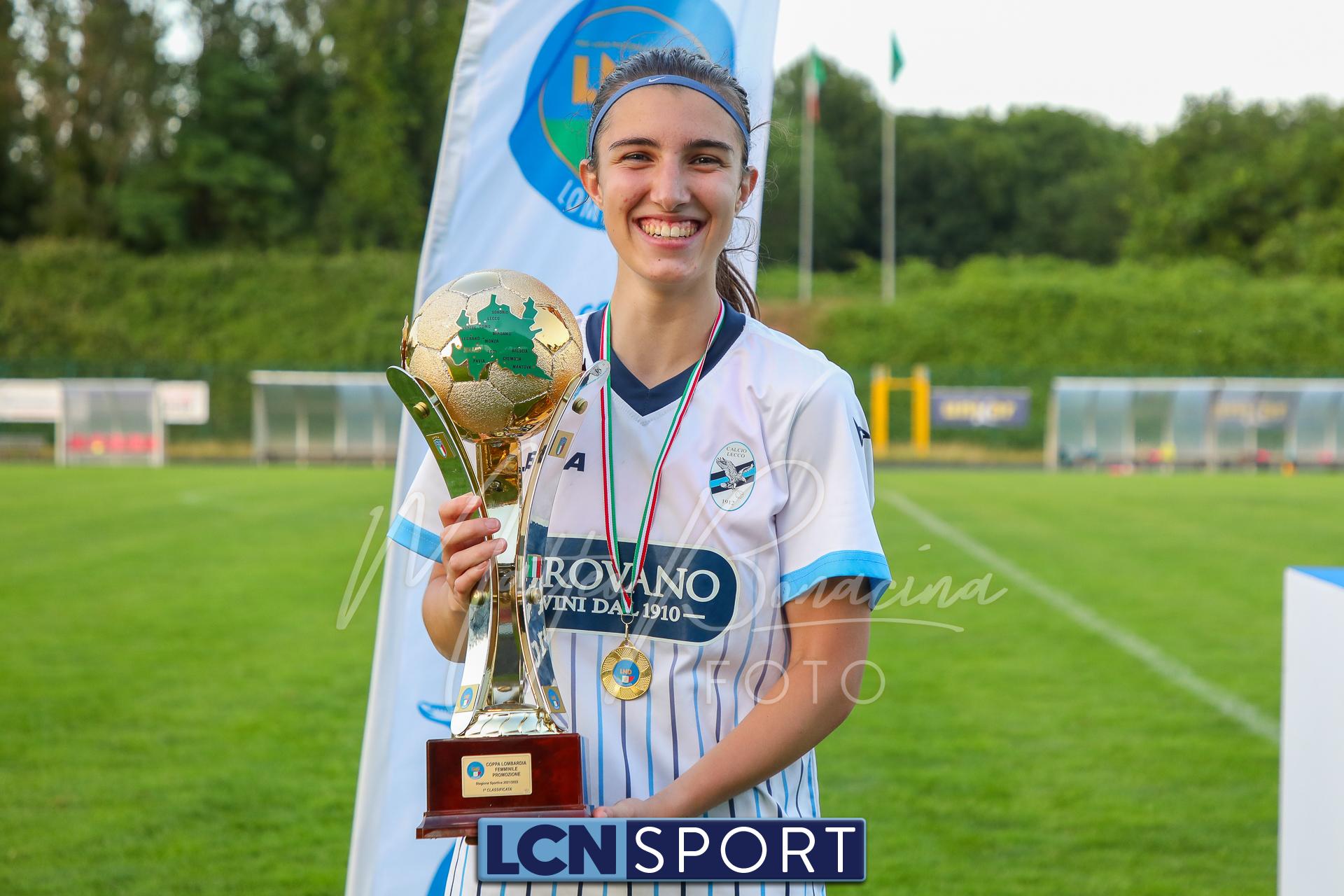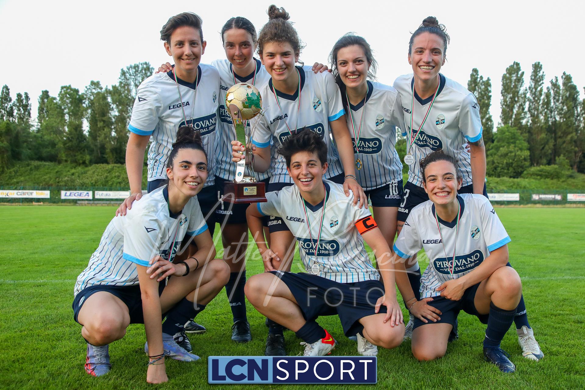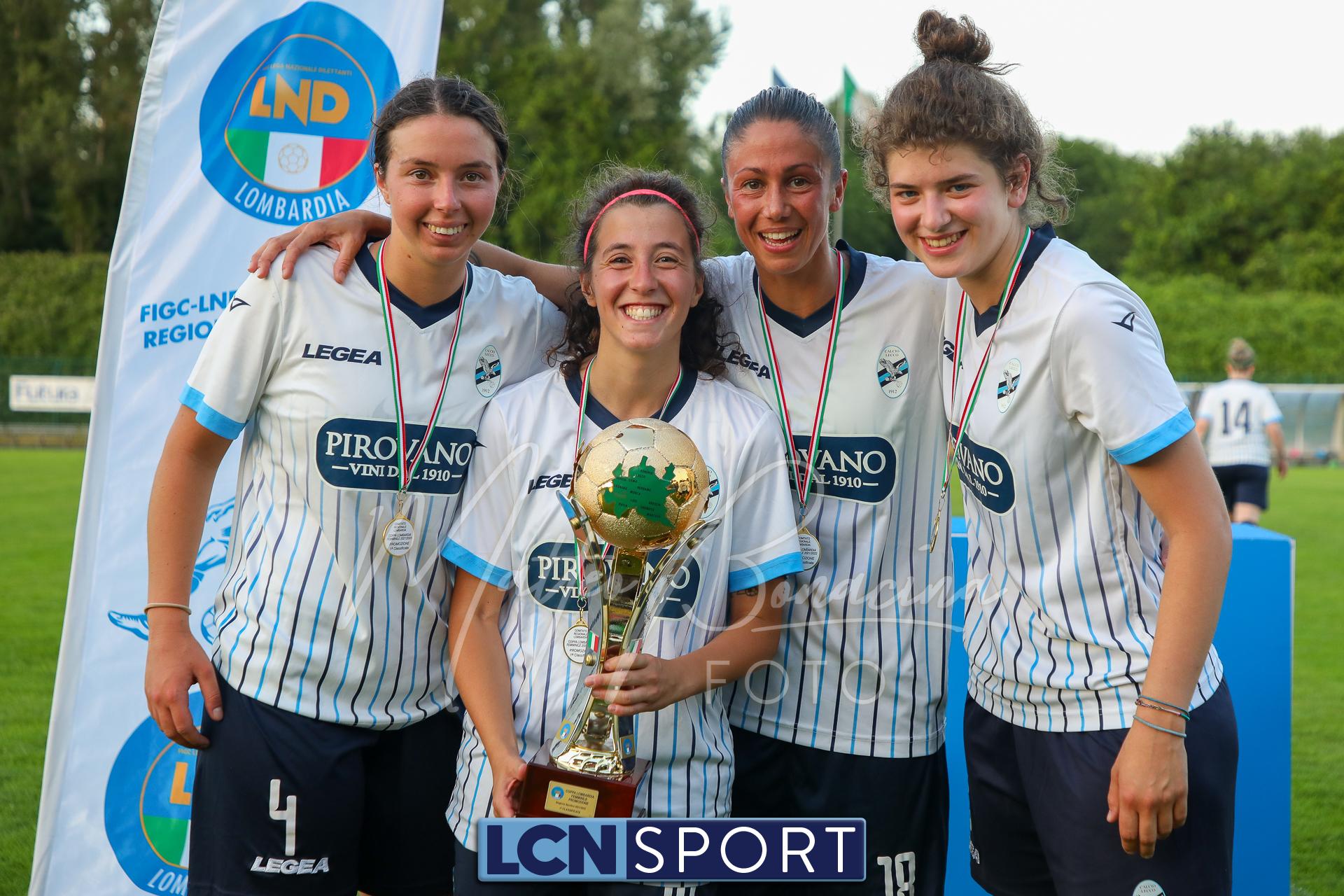 Super Lecco al “Città di Meda”. La Prima squadra femminile conquista anche la Coppa Lombardia di Promozione e completa la doppietta, facendo così il bis con il campionato stravinto qualche settimana fa. Le ragazze di mister Monica Iustoni fanno vedere tutto il proprio potenziale, schiantando nuovamente il Città di Varese, già battuto nella fase ai gironi, nella finalissima del trofeo regionale. Il finale non lascia spazio a interpretazioni: 7-1, arrivato nonostante l’iniziale vantaggio conquistato dalle biancorosse; una partenza con il freno a mano che non ha impedito alle Aquile di far valere il proprio tasso tecnico, cresciuto ulteriormente nella fase finale dopo l’entrata in campo della senatrice Serena Galli. Felicità anche per il vicepresidente Gino Di Nunno, che ha fatto i propri complimenti alle blucelesti e ha poi fatto intervenire telefonicamente il patron Paolo Leonardo Di Nunno, che ha ribadito la soddisfazione per il secondo trofeo stagionale conquistato.