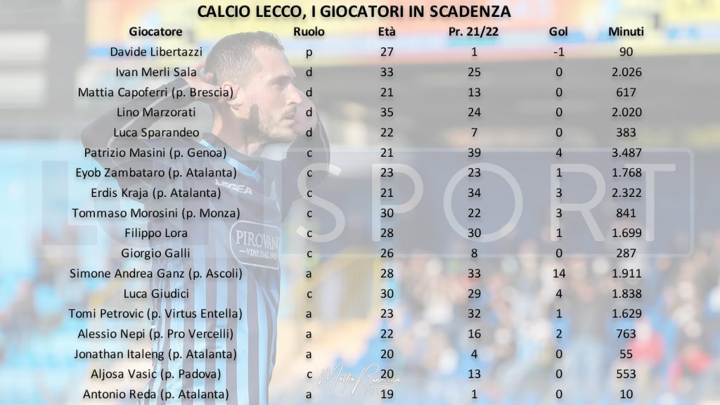 Ultimo giorno di contratto per tanti protagonisti dell’ultima stagione bluceleste. Dalla mezzanotte del 1° luglio 2022, infatti, ben diciotto elementi andranno in scadenza, diventando svincolati o facendo rientro alle rispettive società di appartenenza dopo l’anno passato in prestito all’ombra del Resegone. C’è chi, come la stella Simone Andrea Ganz, farà entrambe le cose, chiudendo il proprio rapporto con l’Ascoli dopo aver brillato con la maglia delle Aquile, il che ne fa un pezzo pregiatissimo del mercato, non a caso inseguito anche dalla neopromossa Novara al pari di Marco Pissardo. 33 presenze e 14 gol per l’erede di “El segna sempre lu” Maurizio, terzo miglior bomber italiano del 2022 (12 gol) dietro a Ciro Immobile (16) della Lazio e all’imprendibile Matteo Brunori (22) del Palermo promosso in Serie B. Il trasferimento avvenne il 31 agosto 2021 dopo aver sottoscritto una sorta di preaccordo tra il Lecco e lo stesso attaccante, ma molto difficilmente il nuovo corso bluceleste avrà la forza economica per trattenere in rosa la sua stella. Guardando oltre, nella lunga lista ci sono anche l’esperienza di Tommaso Morosini, di rientro al Monza, Filippo Lora, inseguito dall’Arzignano Valchiampo, Lino Marzorati, Davide Libertazzi, le cui possibili conferme sono quantomeno in bilico, e Ivan Merli Sala, sulla via di Olginate, ma pure la voglia di riscatto di Giorgio Galli dopo la sfortuna patita nel biennio bluceleste. Difficile valutare la stagione di Luca Sparandeo, subito bloccato da un infortunio e quindi sceso in campo solo sette volte, con due espulsioni rimediate ma anche con buone cose fatte vedere.