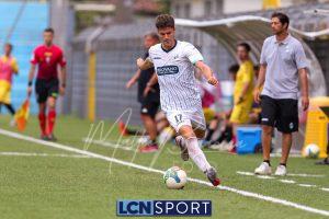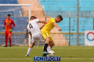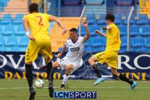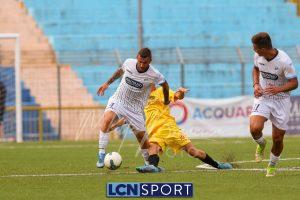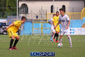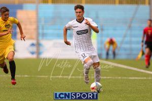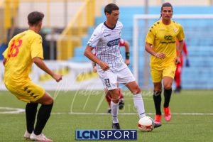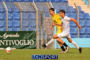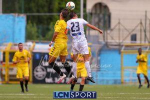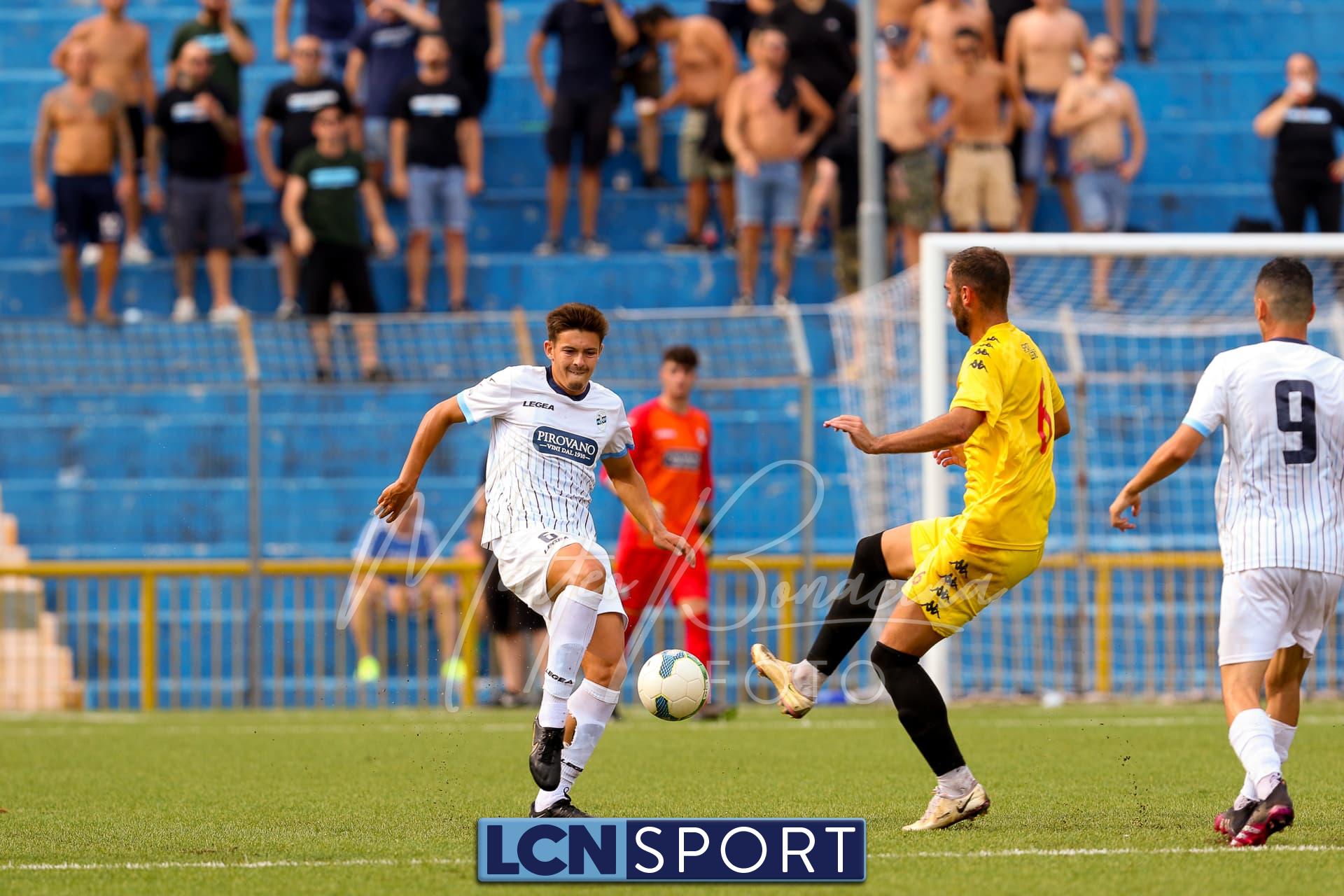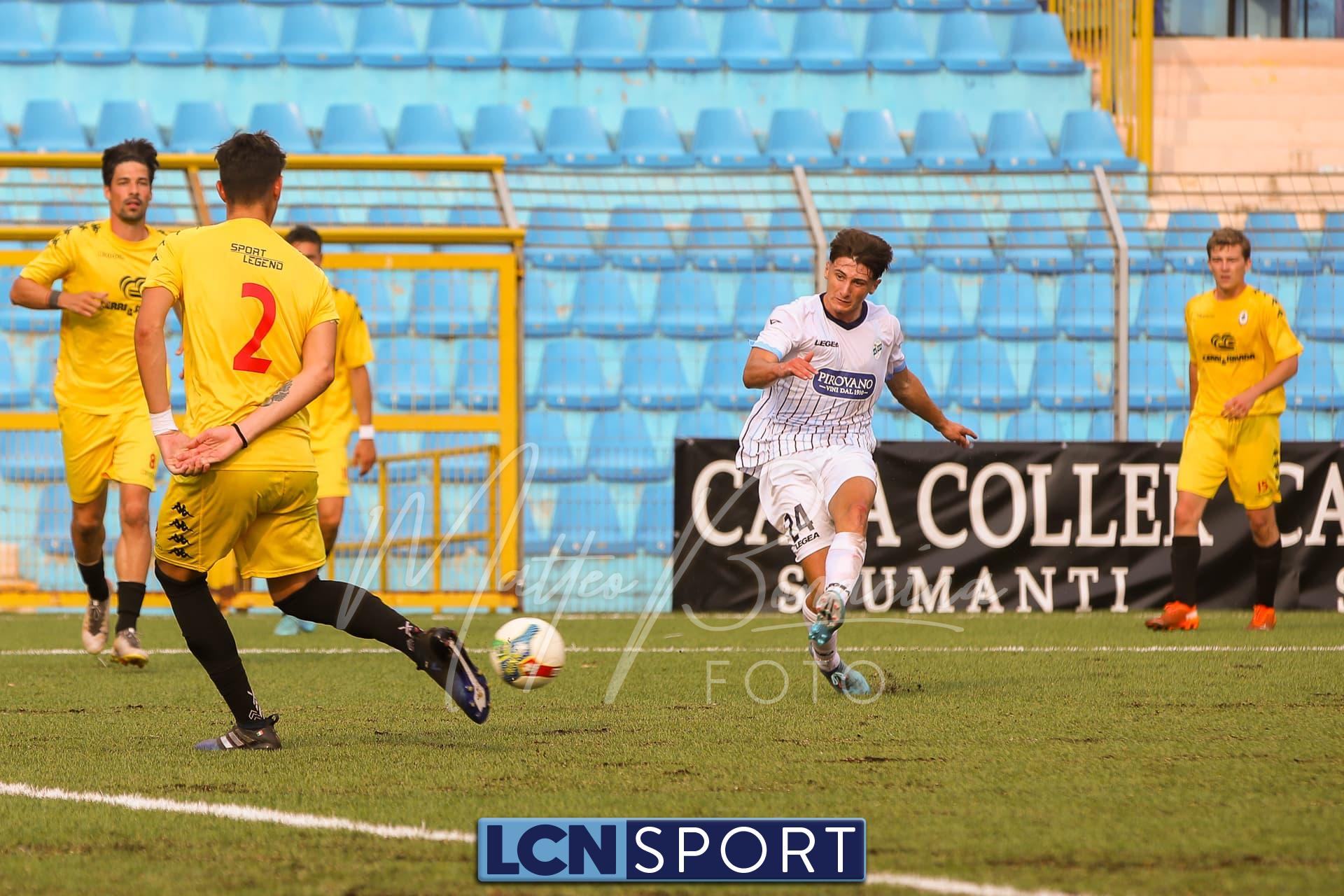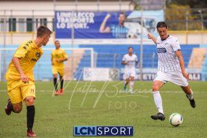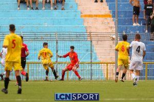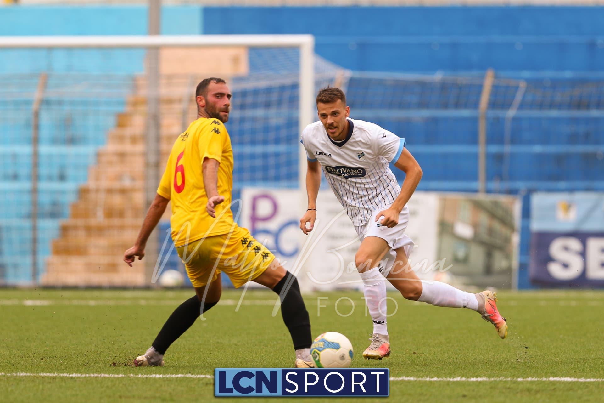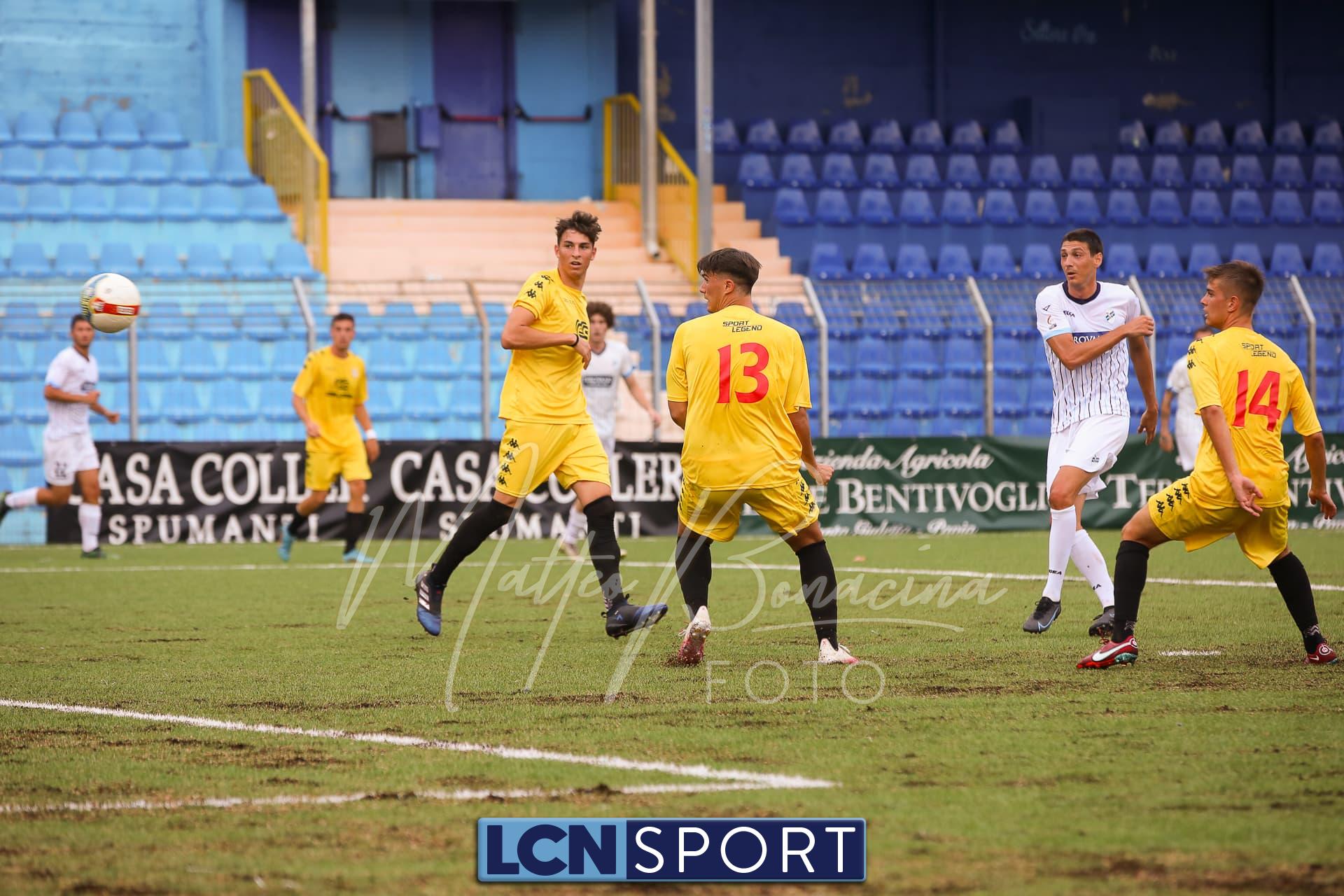 Al 3′ Buso scappa sulla destra e calcia forte sotto la traversa, ma Ferrara para bene; quattro minuti dopo, però, il portiere ospite non può nulla sul rigore conquistato e trasformato dallo stesso “9” bluceleste, schierato a fianco dell’interessante Longo nel 3-5-2 iniziale. Segue una fase di stanca che dura fino al 32′, quando il Sant’Angelo si crea una buona chance che Battistini sventa, mentre al 38′ è Longo a calciare fuori, in diagonale, lanciato a tu per tu con Ferrara. Minuto 43′: Purro in diagonale con il sinistro, Ferrara si esalta. Al 45′ Bugno s’invola nella zona centrale in contropiede, ma Enrici sporca la sua conclusione dal limite.
