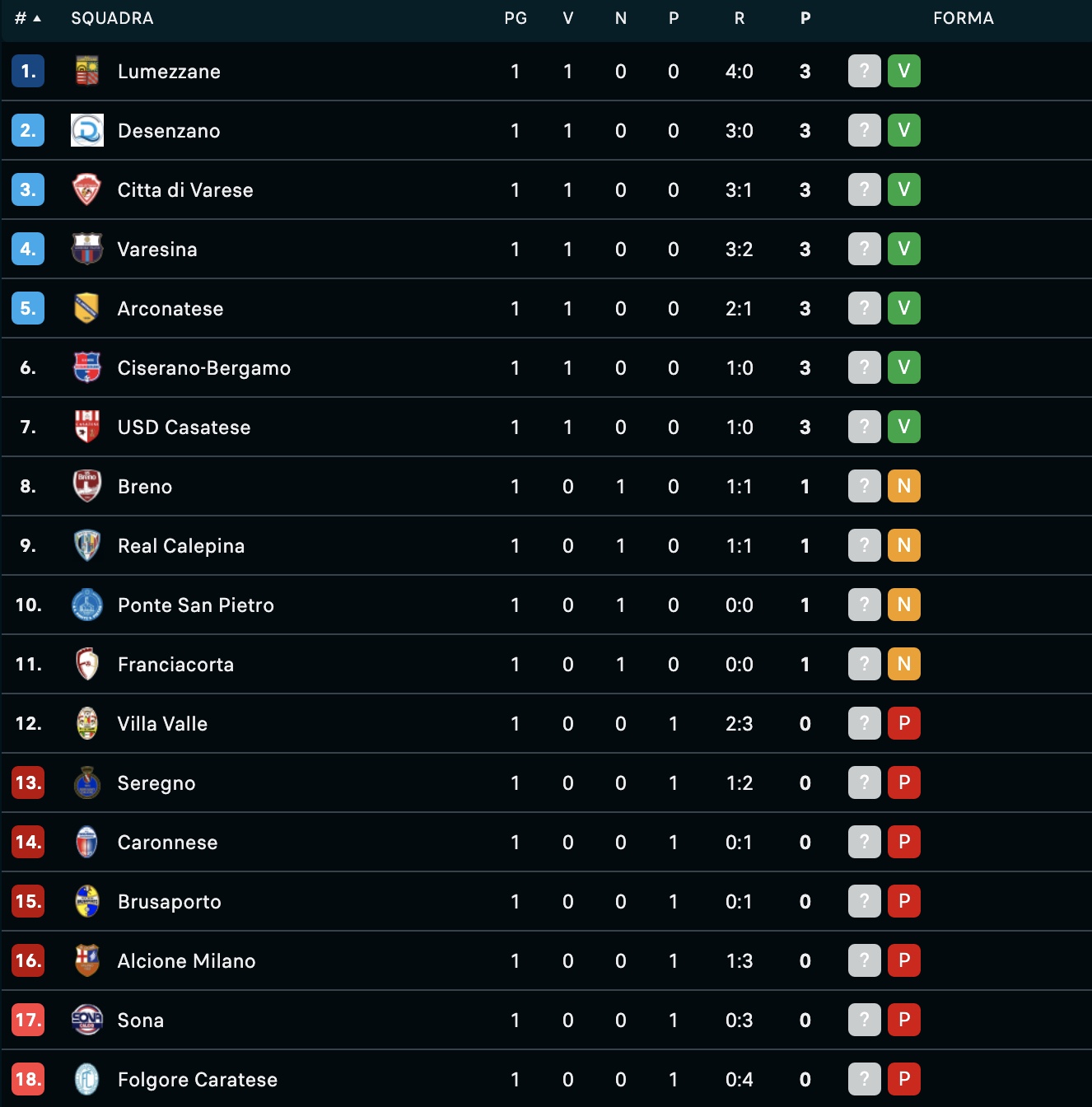 I risultati della 1^ giornata