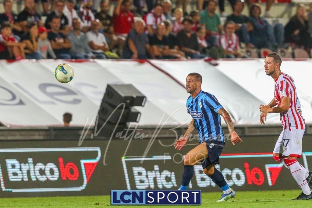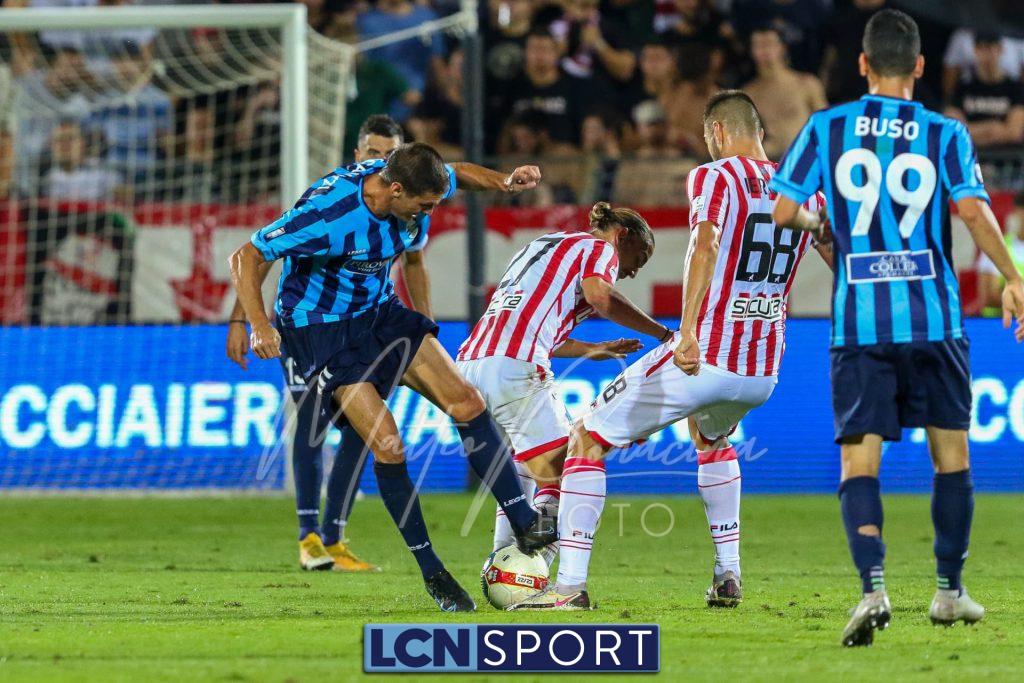 Calcio Lecco 1912 5: c’è una partita prima il raddoppio di Ferrari, buona nonostante lo svantaggio, e una partita che inizia dopo il raddoppio del centravanti biancorosso. E in quella i blucelesti fanno da spettatori non paganti.