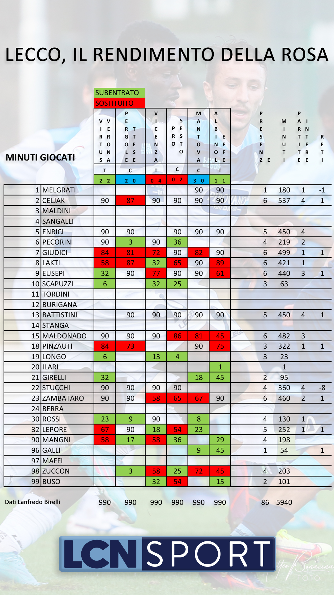 Insomma Lecco-Juventus Next Gen di mercoledì (ore 18) apre alla possibilità di vedere una formazione largamente rimaneggiata sul fronte delle Aquile, anche per capire quanto possano dare coloro che fanno parte del gruppo bluceleste ma, per tutta una serie di motivi, finora non si sono potuti mettere in mostra fino in fondo durante le partite ufficiali. Logico attendersi un turno di riposo per elementi come Celjak, 537′ in stagione, Enrici e Battistini, 450′ a testa, ma pure per la coppia d’attacco Eusepi–Pinzauti, per le ali Zambataro–Giudici per il regista Maldonado, giusto per fare degli esempi. Chance che magari potrebbe ripresentarsi anche per il portiere Simone Stucchi, zero-minuti-zero con Foschi dopo i 360′ accumulati con Tacchinardi. Materiale da cui attingere ce n’è, anche se i cambi vanno sempre fatti con un certo equilibrio quando si parla di competizioni ufficiali.
