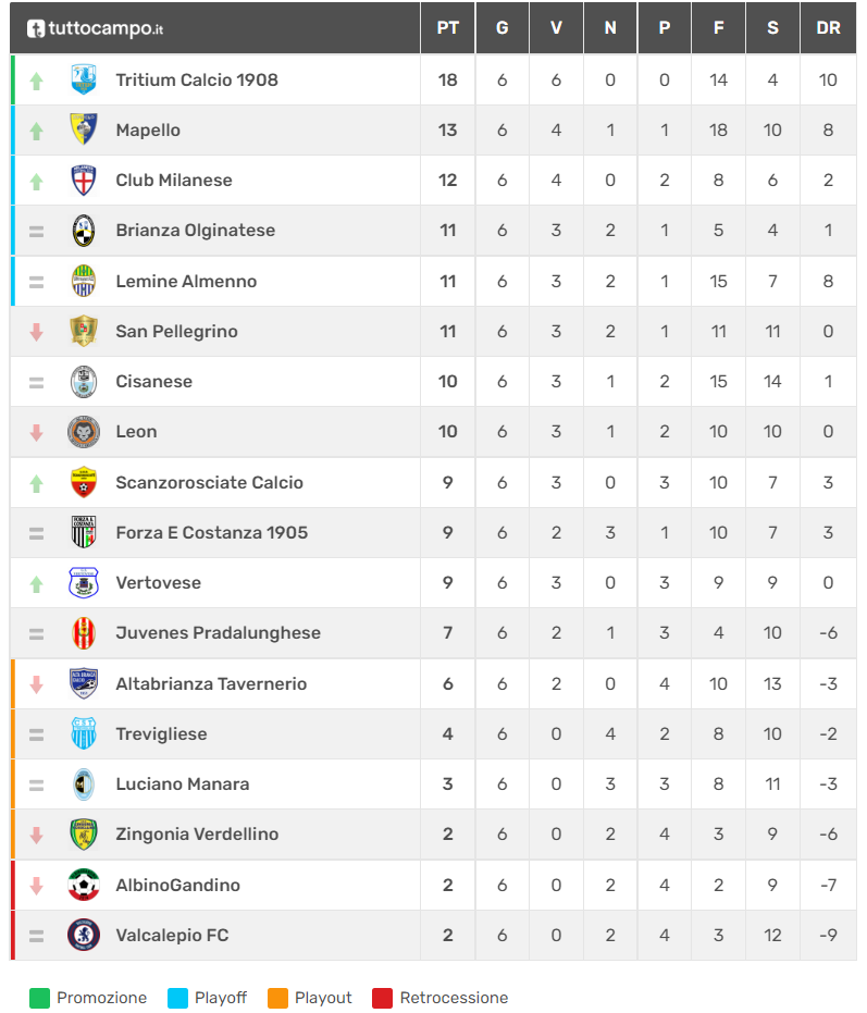 Alla vigilia della sesta giornata di campionato la classifica vede al primo posto a punteggio pieno la Tritium, mentre all’inseguimento ci sono soprattutto il Mapello e il Club Milanese: i gialloblù sono a meno 5 dalla capolista, invece i biancorossi, attualmente terzi, hanno una lunghezza in meno rispetto al secondo piazzamento in graduatoria. Subito sotto ci sono i ragazzi di Delpiano, che, insieme a Lemine Almenno e San Pellegrino, condividono momentaneamente lo status di possibili outsider. Invece il Manara si colloca nella zona degli spareggi salvezza, ma attenzione perchè i biancoazzurri sono più vicini alla zona rossa che a quella della salvezza tranquilla. Situazione non facile che può cambiare in meglio nel corso delle prossime partite.