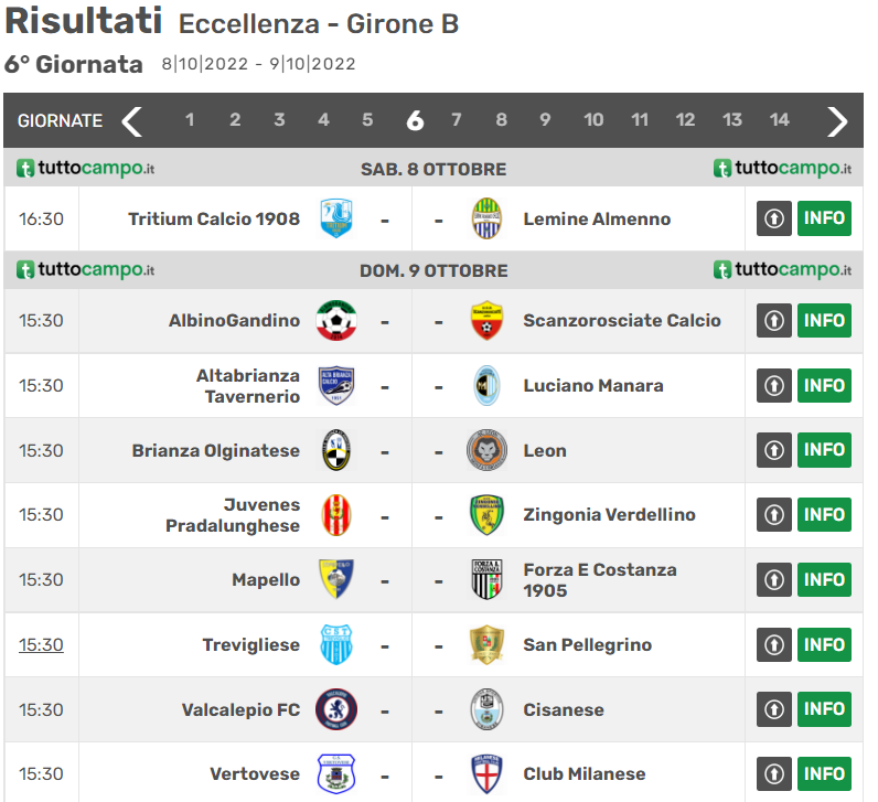 Il settimo turno comincerà con l’anticipo del sabato pomeriggio tra la Tritium, capolista a punteggio pieno, e il Lemine Almenno, che invece è reduce dalla vittoria casalinga contro un AlbinoGandino in grande difficoltà a livello di risultati e che attualmente possiede 11 punti, che gli permettono di navigare nei piani alti della graduatoria. Le restanti gare della sesta giornata del girone B di Eccellenza lombarda possono essere consultate sulla seguente immagine: