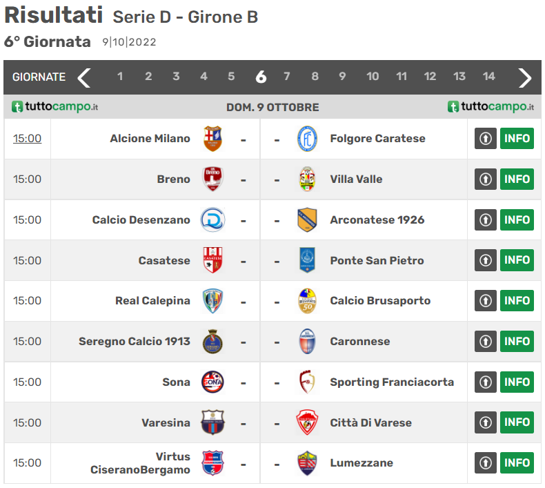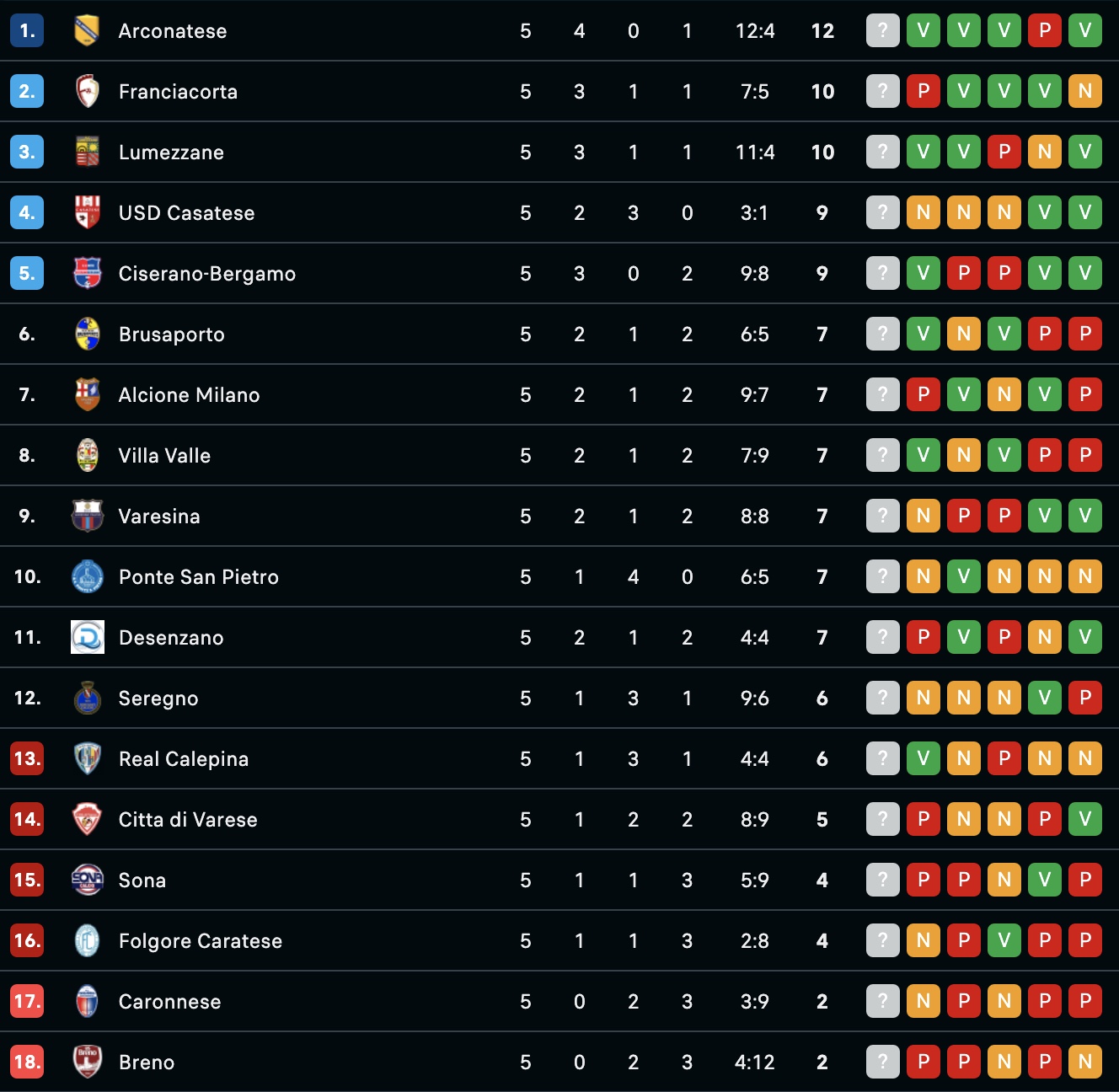 Domenica pomeriggio non saranno in campo solo Casatese e Ponte San Pietro, ma anche tutte le altre formazioni, tra cui Lumezzane e Virtus CiseranoBergamo, che si incroceranno nella bergamasca in una partita che ha il sapore di alta classifica, quindi sarà un incontro da seguire con attenzione. Il Franciacorta, altra compagine ai piani alti, sfiderà in trasferta un Sona nei bassifondi della graduatoria che avrà il compito di cercare di ribaltare lo sfavorevole pronostico, detenuto anche dal Desenzano Calvina in zona salvezza che affronterà nel suo stadio la capolista Arconatese. In questo avvio di campionato due squadre blasonate stanno faticando, ovvero Seregno e Varese: i brianzoli, in particolare, dopo 5 gare di Serie D e la terza divisione disputata nella stagione scorsa, navigano tra la zona degli spareggi salvezza e quella della salvezza tranquilla, situazione migliorabile già dall’abbordabile prossima sfida contro la Caronnese, che è in fondo alla graduatoria con 2 punti insieme al Breno, mentre subito sotto il Seregno troviamo i biancorossi che hanno recentemente cambiato guida tecnica assumendo De Paola, vecchia conoscenza della Calcio Lecco, testimonianza del momento difficile in casa Varese, compagine che non vince dalla prima giornata e che ha già l’occasione di incrementare il suo bottino di punti nel derby con la Varesina.