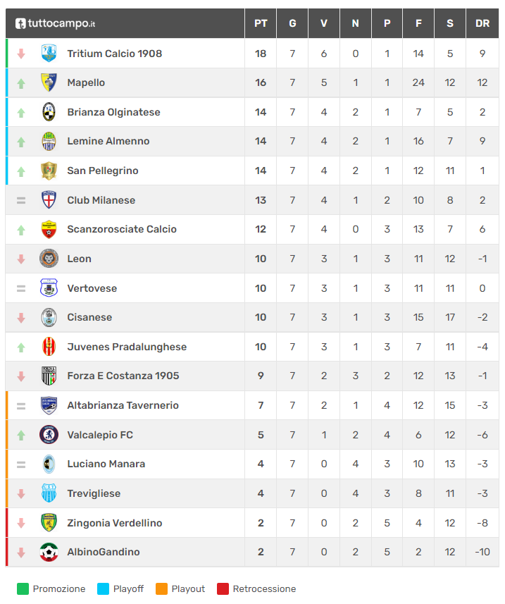 Di seguito viene proposta la graduatoria del girone B di Eccellenza lombarda dopo sette giornate di campionato: