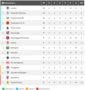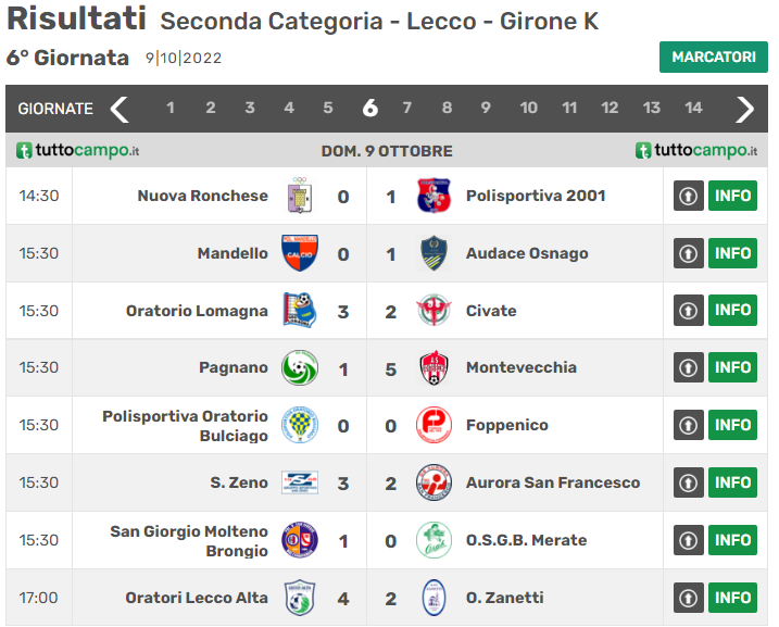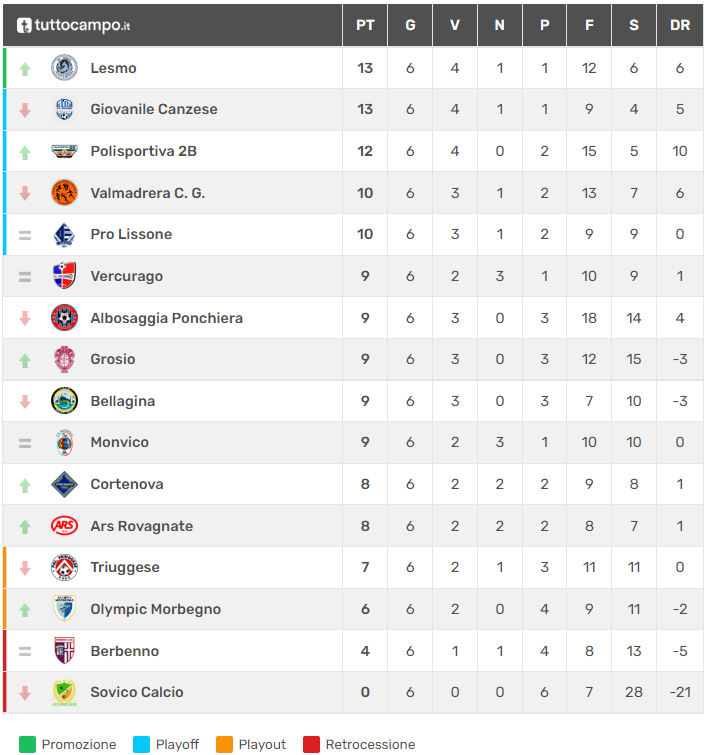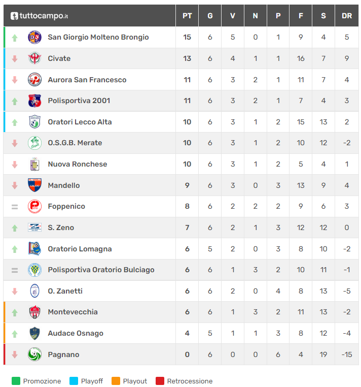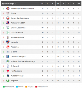 Il Civate perde la vetta della graduatoria per l’inaspettato 3 a 2 del Lomagna che guadagna punti importanti per la salvezza. Quindi la nuova capolista è il Molteno che ha vinto di misura in casa con un Merate in lizza per gli spareggi promozione. A 11 punti ci sono invece l’Aurora San Francesco, che domenica è uscita sconfitta dal campo del S. Zeno in una gara aperta, e la Pol. 2001 che fa gioire i suoi tifosi grazie alla decisiva rete di Redaelli. Immediatamente sotto troviamo anche Lecco Alta che ne rifila quattro alla Zanetti, quest’ultima a rischio zona playout come altre compagini del girone come il Montevecchia, che però porta a casa una larga ed essenziale vittoria contro il fanalino di coda Pagnano che è ancora a secco di risultati. L’Osnago, anch’esso in lotta per una salvezza tranquilla, vede momentaneamente il suo obiettivo più vicino grazie al bottino pieno maturato in trasferta con il più quotato Mandello. Infine Bulciago e Foppenico realizzano un pari a reti bianche utile ad entrambe per non rimanere a secco di punti in questa sesta giornata. La classifica e i risultati domenicali del girone possono essere consultate nelle seguenti immagini: