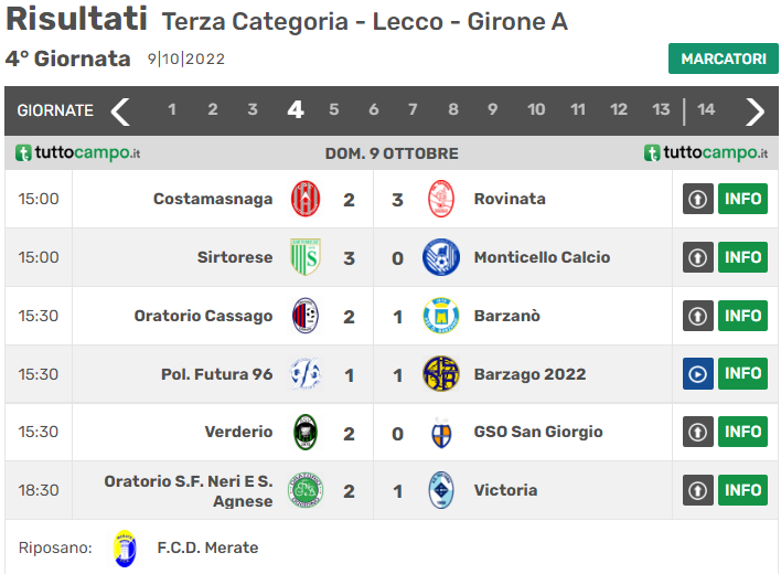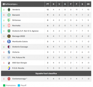 Il raggruppamento nostrano di Terza Categoria è guidato dal Verderio che in queste 4 partite ha solo vinto. Il 2 a 0 dei biancoverdi contro il GSO San Giorgio tiene alla larga un Barzanò caduto a Cassago Brianza contro la squadra locale. La Sirtorese, con la vittoria domenicale in casa con il Monticello, si accasa al provvisorio terzo posto con 8 punti. I restanti piazzamenti utili per gli spareggi promozione sono attualmente occupati dalla Rovinata e dall’Oratorio S.F. Neri E S. Agnese: in particolare, i biancorossi, che detengono il vantaggio della partita in meno a differenza delle attuali squadre di testa, hanno fatto bottino pieno a Costamasnaga, mentre la formazione di Oggiono tra le mura amiche ha centrato i 3 punti con la Victoria. Rovinata e Oggiono però hanno alle calcagna tre squadre, cioè il Barzago, che domenica ha portato a casa solo un punto con una Futura alla prima partecipazione al campionato di Terza Categoria, l’Oratorio Cassago e il Monticello. La classifica e i risultati domenicali del girone possono essere consultate nelle seguenti immagini: