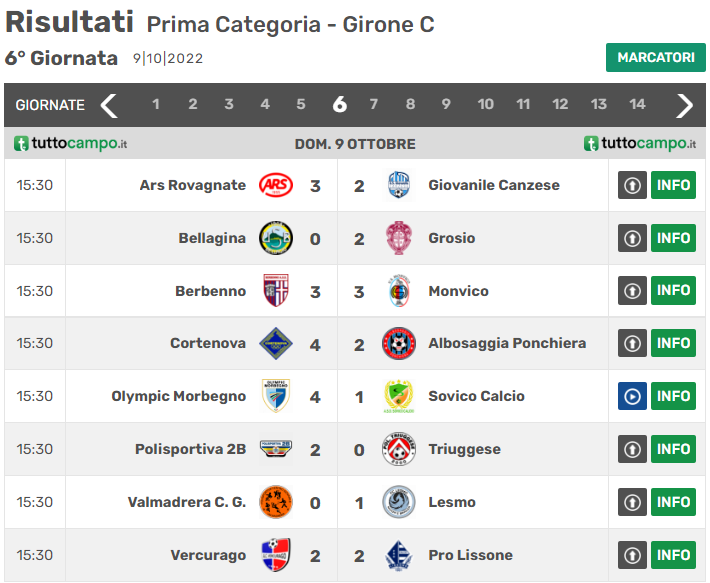 Nel girone C di Prima Categoria spicca il sorprendente risultato del Rovagnate in casa con la capolista Canzese, che viene sconfitta per 3 a 2 dai lecchesi a segno grazie alla tripletta di Mercuri, che temporaneamente fa uscire i biancorossi dalla zona calda. Lo stesso discorso di classifica vale anche per il Cortenova che ribalta il pronostico contro l’Albosaggia Ponchiera. La Polisportiva 2B fa bottino pieno tra le mura amiche con la Triuggese risultato che porta la società di Brivio ad un passo dalla prima posizione che è ancora occupata da Canzese e Lesmo, quest’ultimo ha ottenuto i 3 punti proprio con il Valmadrera, che, nonostante la sconfitta, rimane in zona playoff. Nello scontro dei bassifondi della graduatoria la formazione nostrana ne esce vincitrice: 4 a 1 del Morbegno in casa contro il Sovico, risultato che al momento toglie l’Olympic dal binomio di coda temporaneamente a rischio retrocessione. Il Vercurago riesce invece a strappare un punto in casa con il Lissone ritrovandosi a meno uno dalla zona degli spareggi promozione. Nulla da fare per la Bellagina contro il Grosio che vince 0 a 2, ma i gialloneri sono ad una lunghezza dalla zona playoff. La classifica e i risultati domenicali del girone possono essere consultate nelle seguenti immagini: