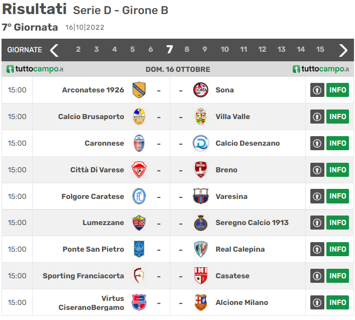 Oltre all’interessante gara di vertice tra Franciacorta e Casatese, quindi, la formazione lecchese giocherà in terra bresciana, la settima giornata del girone B di quarta serie offre anche la sfida tra Brusaporto e Villa Valle utile per capire quale delle due compagini si porterà maggiormente verso il gruppo di vertice. Il club lecchese e i granata in questa stagione si sono già sfidati nell’impegno estivo del Comunale di Casatenovo nel Primo Turno della Coppa Italia di categoria, conclusosi con una vittoria di misura per ospiti grazie a capitan Piccinini. L’Arconatese, almeno sulla carta, ha una sfida alla portata con il Sona tra le mura amiche, ma nel calcio il pronostico non coincide sempre con il reale risultato del match, mentre il Lumezzane gareggerà con un blasonato Seregno che non sta rispettando le aspettative, anche se ora i brianzoli sono a meno uno dalla zona degli spareggi. La Varesina incontrerà in trasferta una Folgore Caratese alla ricerca di punti per la salvezza tranquilla. Infine, il Varese tenterà di invertire la sua attuale tendenza negativa con il fanalino di coda Breno. Di seguito classifica e sfide del settimo turno del girone B di Serie D: