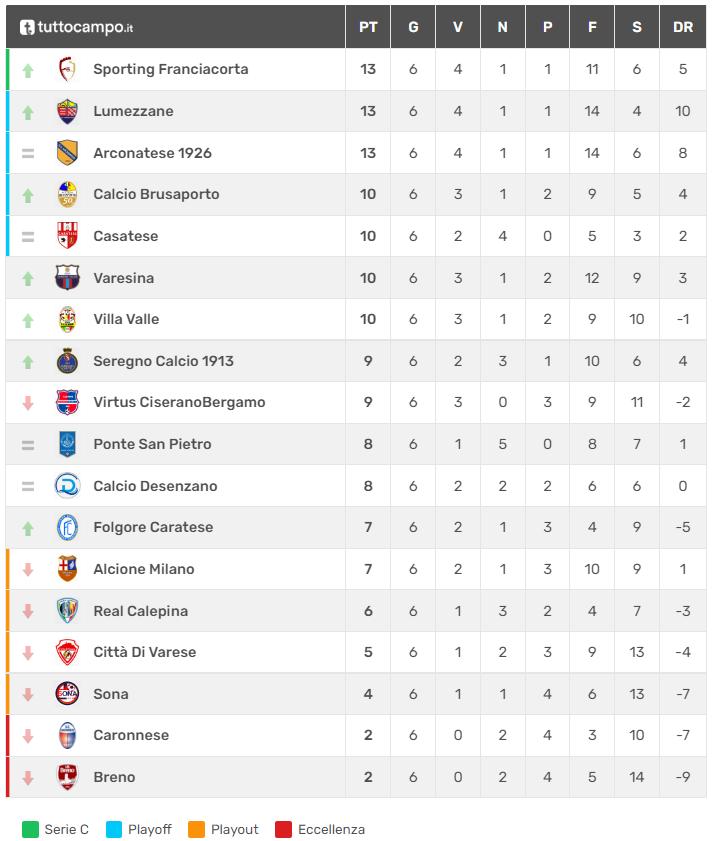 La Casatese rimane ancora imbattuta in campionato insieme al Porte San Pietro, che i lecchesi hanno affrontato proprio nel turno precedente ottenendo un deludente, per com’è maturato, 2-2 – quarto pareggio consecutivo per i biancorossi – e sfiorando una vittoria che sembrava raggiunta fino al 95′, quando Capelli, autore di una doppietta, ha battuto Picarelli con l’ultima palla utile per raddrizzare la situazione per la seconda volta nel match. La formazione brianzola è stata raggiunta anche dopo il primo vantaggio con una risposta abbastanza tempestiva. Capitolo chiuso: è giunto il momento di pensare alla prossima sfida, che non sarà semplice, dato che la formazione locale incrocerà lo Franciacorta, cioè una delle “quota 13” che stanno al momento dominando la graduatoria assieme ad Arconatese, che domenica ha avuto una battuta d’arresto sul campo del Desenzano (2-2) e Lumezzane, che ha agganciato gli arancioblù con un deciso 0-3 servito a Ciserano. I prossimi avversari degli uomini di Commisso inoltre hanno vinto in trasferta domenica contro il Sona rifilandogli quattro reti. Subito sotto al trio di testa troviamo una serie di squadre, inclusa la formazione nostrana, a quota 10 punti e in lotta per accaparrarsi i posti playoff come la Varesina, reduce dalla vittoria contro il Città di Varese dell’ex mister bluceleste De Paola: in particolare, quest’ultima compagine si trova attualmente in difficoltà a livello di classifica e risultati, di ciò infatti ne è testimone il 4-1 subito per mano della formazione di casa, che ha fatto andare in gol anche il giovane Sberna, prodotto dell’accademy della Calcio Lecco. Da non dimenticare tra le inseguitrici anche Brusaporto e Villa Valle, entrambe uscite dalle rispettive sfide domenicali con il bottino pieno.