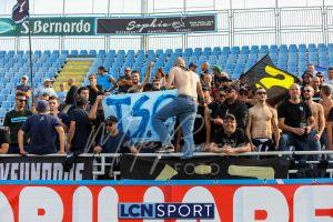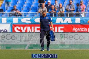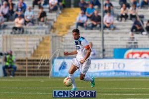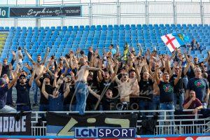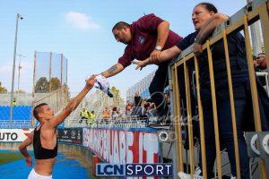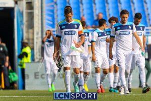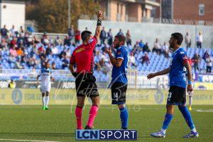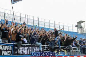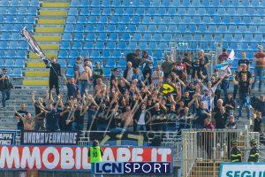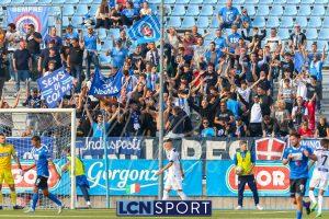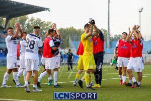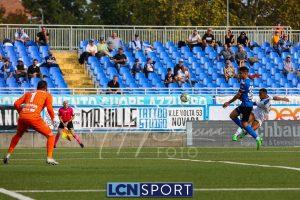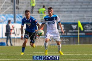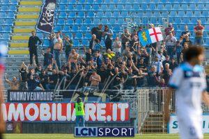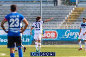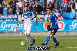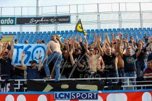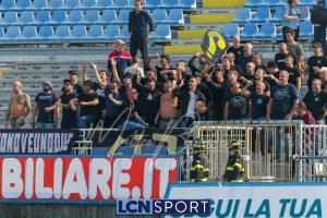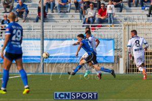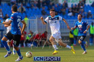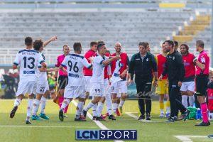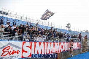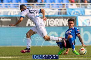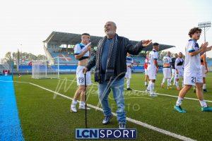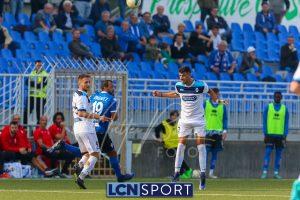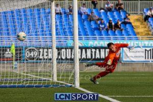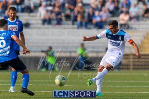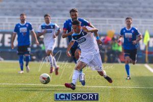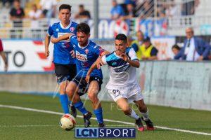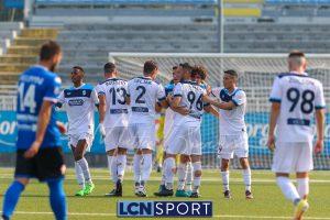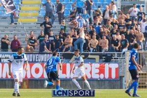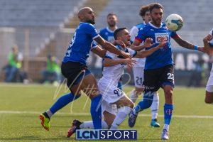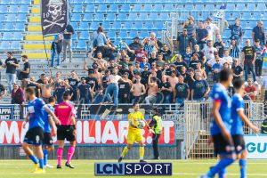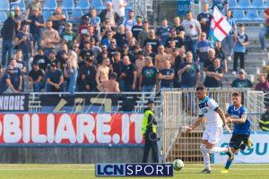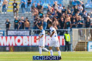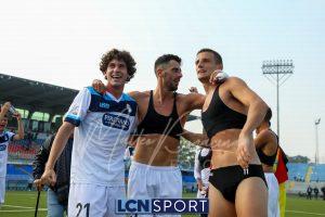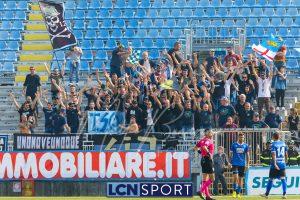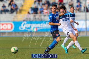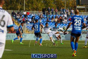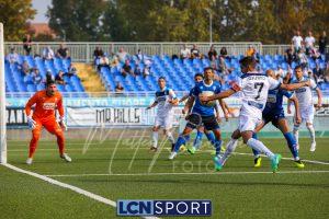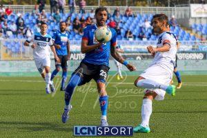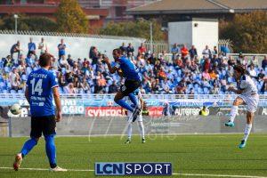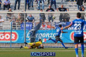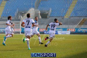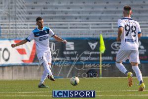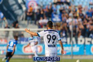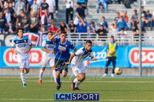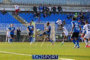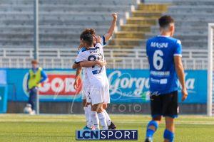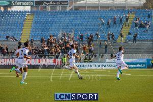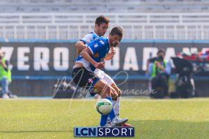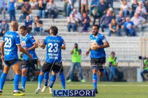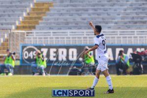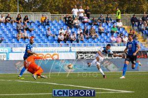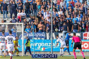 Al 26′ Battistini recupera palla davanti alla difesa, galoppa per quaranta metri palla al piede e apre per Zambataro che di prima serve Buso sulla corsa; il numero 99 punta la porta, sterza sull’uscita di Pissardo e con il sinistro lo fulmina per il vantaggio ospite. I blucelesti esultano mostrando la maglia di Eusepi (squalificato sei mesi) in tribuna.
