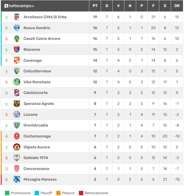 Subito sotto la capolista Arcellasco Città di Erba troviamo, a tre punti di distanza, Arcore e Sondrio. Le due squadre in questione dovranno sfidare delle compagini lecchesi per guadagnarsi il bottino pieno: in particolare, i brianzoli saranno di scena tra le mura amiche con un Calolziocorte reduce dal mezzo passo falso con la Concorezzese (2-2) e voglioso, a maggior ragione, di ribaltare il pronostico, mentre i biancazzurri giocheranno in casa con un’Aurora Olgiate alla ricerca di punti utili per staccarsi dalla zona playout e che nella scorsa partita ha vinto in maniera schiacciante con il Costamasnaga (5-0). Il Cavenago ospiterà l’ultima in classifica, ovvero il nostrano Missaglia Maresso che dovrebbe quindi provare a risollevarsi con una compagine di vertice, cosa sulla carta non semplice. A due lunghezze dai giallorossi che occupano l’ultimo pass per i playoff c’è la ColicoDerviese, domenica impegnata nel derby locale in casa del Galbiate a quota 6 punti, che deve provare a incamerare tre punti per riemergere dalle sabbie mobili. I gialloblù dell’Alto Lago hanno appena ufficializzato l’acquisto dell’attaccante classe 1999 Papa Diop e inseguono la Vibe Ronchese, che giocherà in casa con la GrentArcadia che viene da due vittorie consecutive tra cui quella pesante di settimana scorsa con l’Arcore (2-1). Risultati positivi della squadra lecchese, che gli stanno permettendo di veleggiare poco sopra la zona playout. Nella medesima area troviamo anche il Costamasnaga, che sul suo campo affronterà il Lissone in una sfida, almeno sulla carta, interessante ed equilibrata.