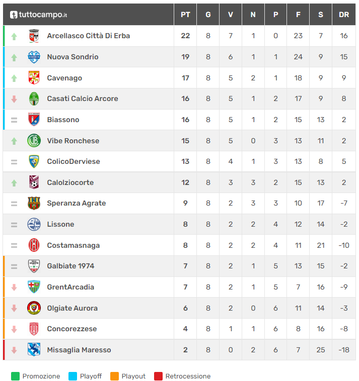 Dopo due vittorie consecutive con Concorezzese e Arcore, la GrentArcadia perde di misura contro la Vibe Ronchese in trasferta (1-0). Dopo il risultato negativo la formazione nostrana si trova in zona playout a 7 punti a pari merito con il Galbiate, quindi a una singola lunghezza dalla comfort zone. Immediatamente sotto alla società di Valgreghentino e ai biancoverdi abbiamo a quota 6 punti l’Olgiate Aurora: quest’ultimi nel match domenicale di campionato subiscono il poker con l’ambizioso Sondrio segnando una sola rete (4-1). Sconfitta che costringe i giallorossi alla zona playout, dove si colloca anche la Concorezzese a meno due. Il fanalino di coda Missaglia Maresso invece giunge alla quarta sconfitta di fila in trasferta con il Cavenago attualmente terzo in classifica che gliene rifila 4. La situazione in casa biancoblù va risollevata al più presto per evitare di scendere direttamente nella categoria inferiore, ma è ancora tutto possibile dato che il campionato non è iniziato da molto tempo, ma soprattutto perchè la distanza dalla zona degli spareggi salvezza è tutt’altro che incolmabile essendo di soli due punti.