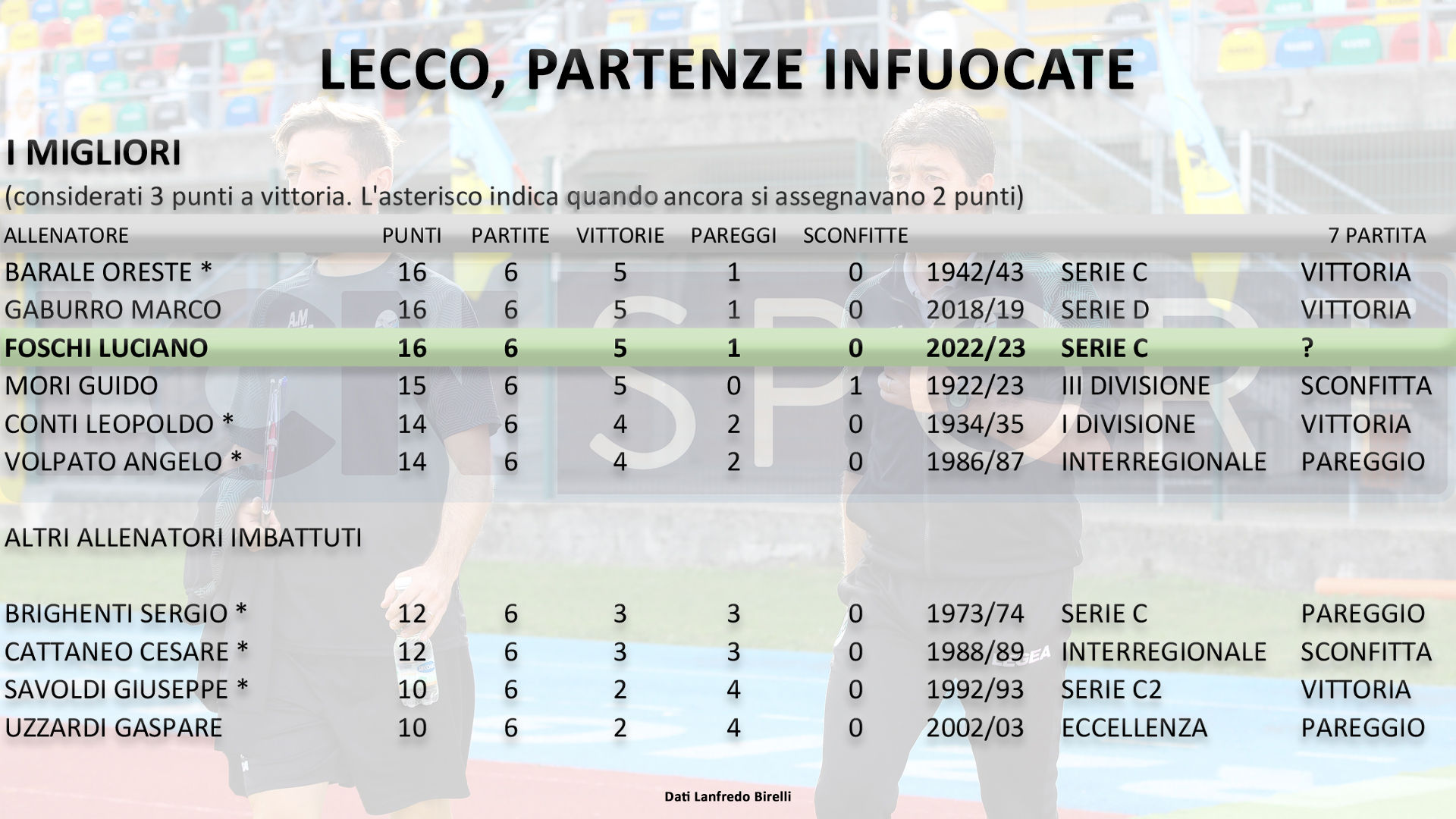 Corsi e ricorsi storici. Con il Trento mister Luciano Foschi può continuare a tenere il ritmo di due predecessori come Marco Gaburro e, prima di lui, Oreste Barale. Roba che risale al 2018 nel primo caso e alla stagione 1942/1943 nel secondo: cinque vittorie nelle prime sei gare da nuovi allenatori all’ombra del Resegone, successo anche per quanto riguarda la settima gara, come ricostruito da Lanfredo Birelli. Poco peggio sono stati in grado di fare Guido Mori (15 punti, 1922/1923), Leopoldo Conti (14 punti, 1934/1935) e Angelo Volpato (14 punti, 1986/1987). Partenze lanciate o, meglio, infuocate visto la bruciante quantità di punti messi in cascina dopo aver raccolto l’eredità di chi militava sulla stessa panchina fino a poco tempo prima.