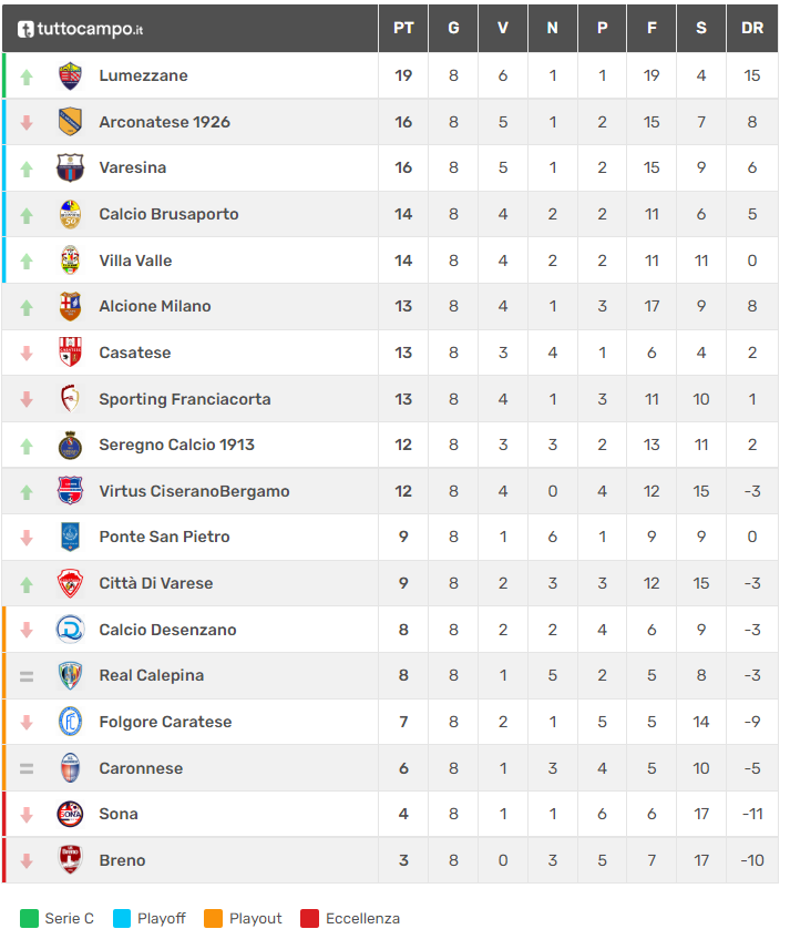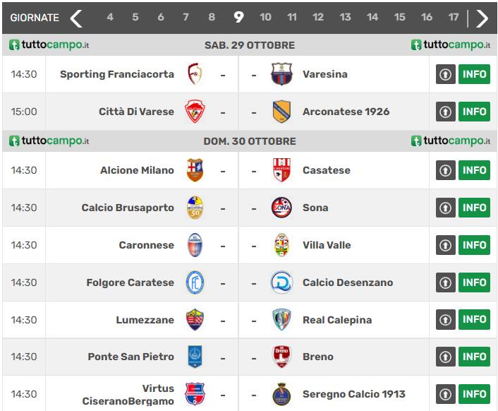 Il turno nove del girone B di quarta serie si apre sabato con due partite assolutamente interessanti come Sporting Franciacorta–Varesina e Varese–Arconatese: il primo match vede sfidarsi i bresciani all’inseguimento dei playoff e una Varesina vicina alla vetta con 16 punti, alla pari con l’Arconatese. I milanesi faranno visita a un Varese veleggiante nella zona di metà classifica con il Ponte San Pietro e appena tornato alla vittoria contro il Desenzano: occhio, dalle parti del “Battaglia” il desiderio di rialzarsi è tanto. La graduatoria è invece capeggiata, come già detto, dal Lumezzane che tenterà di confermarsi con il Real Calepina in zona degli spareggi salvezza. Più in basso rispetto ai bergamaschi in graduatoria troviamo Caronnese e Sona, rispettivamente in zona playout e fascia rossa che domenica non avranno vita facile con Villa Valle in casa e Brusaporto in trasferta. Quest’ultime proveranno a fare bottino pieno per mantenere la propria posizione di vertice. Il blasonato, ma claudicante, Seregno è a due lunghezze dai playoff e sarà di scena a Ciserano in una sfida, almeno sulla carta, equilibrata vista la parità di punti (12) in graduatoria. Gli azzurri riprenderanno la marcia dopo la vittoria casalinga contro la Caratese? Questa e altre domande avranno risposta nel fine settimana di campionato. Di seguito vengono proposte le prossime sfide e la classifica del girone B di Serie D: