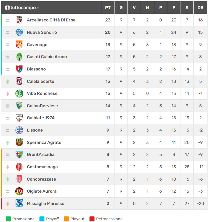 La capolista Arcellasco a quota 23 punti domenica sarà in terra brianzola per disputare una sfida importante per i piani alti della classifica cioè quella con la Vibe Ronchese a caccia di punti per provare ad insediarsi in zona playoff che dista due punti. L’inseguitrice Sondrio a meno tre dalla vetta ospiterà il Lissone in una gara sulla carta con il pronostico a favore, ma occhio all’intenzione dei biancoblu di mantenere almeno il posizionamento nella parte tranquilla della graduatoria. La decima giornata del girone B di Promozione lombarda vedrà incrociarsi anche Concorezzese e Cavenago: al Bonizzi e Soglio i giallorossi attualmente terzi dovranno cercare di fare risultato per continuare a rincorrere la testa del raggruppamento.