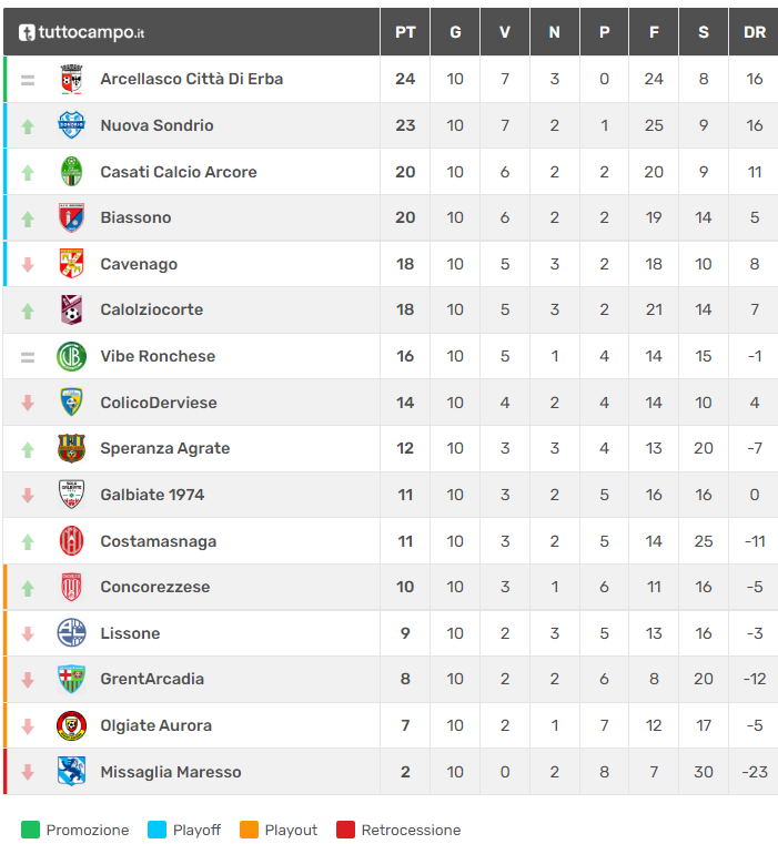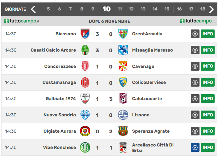 Nel decimo turno di campionato ci sono state due sfide tutte lecchesi: Costamasnaga–ColicoDerviese e Galbiate–Calolziocorte. Il primo match si è concluso a favore della squadra di casa che ha vinto di misura con una pesante rete di Magno, esperto attaccante alla prima rete stagionale. Vittoria che porta i grigiorossi in comfort zone a quota 11 punti a pari merito con il Galbiate, mentre i gialloblù attualmente si trovano in una terra di mezzo ovvero a 4 lunghezze sia dai playoff che dai playout. La seconda partita invece ha maturato un 1-3 che permette agli amaranto di confermarsi il miglior club lecchese a livello di piazzamento in classifica: infatti il Calolziocorte grazie alle reti di Sare, Del Re e Visconti si colloca in fascia playoff a 18 lunghezze con il Cavenago.