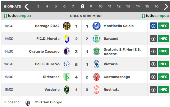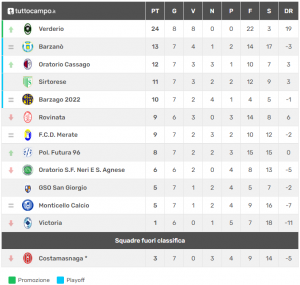 Nell’ottava giornata del campionato locale di Terza Categoria il Verderio capolista continua la sua striscia di sole vittorie battendo di misura la Rovinata tra le mura amiche. Biancorossi che con questa sconfitta escono temporaneamente dalla fascia playoff che però ora si trova a distanza minima. Bisogna inoltre considerare che la Rovinata ha disputato una partita in meno rispetto alle concorrenti della fascia playoff. 2-2 è il risultato finale del match tra un F.C.D Merate a 9 lunghezze e a pari punteggio con la Rovinata e un Barzanò secondo, ma con un distacco dalla vetta già importante. Il Cassago fa tre punti interni con l’Oratorio S.F. Neri E S. Agnese portandosi al terzo posto in graduatoria. In quarta posizione si colloca la Sirtorese a 11 punti: nello specifico al Bearzot i biancoverdi ne realizzano 4 alla fuori classifica Costamasnaga. Attualmente l’ultimo pass per gli spareggi promozione lo ha il Barzago che è a distanza minima dalla Sirtorese e che ha pareggiato 1-1 tra le mura amiche contro il Monticello. Chiudiamo con la cinquina della Futura in casa contro il Victoria: gli ospiti quindi danno modo ai biancoblu di trovarsi al momento in lotta per un posto per gli spareggi promozione che distano un paio di punti. Di seguito vengono proposti i risultati dell’ultima giornata di campionato e la classifica del girone: